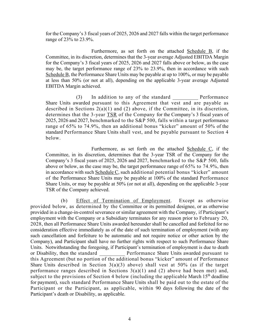 4 for the Company’s 3 fiscal years of 2025, 2026 and 2027 falls within the target performance range of 23% to 23.9%. Furthermore, as set forth on the attached Schedule B, if the Committee, in its discretion, determines that the 3-year average Adjusted EBITDA Margin for the Company’s 3 fiscal years of 2025, 2026 and 2027 falls above or below, as the case may be, the target performance range of 23% to 23.9%, then in accordance with such Schedule B, the Performance Share Units may be payable at up to 100%, or may be payable at less than 50% (or not at all), depending on the applicable 3-year average Adjusted EBITDA Margin achieved. (3) In addition to any of the standard __________ Performance Share Units awarded pursuant to this Agreement that vest and are payable as described in Sections 2(a)(1) and (2) above, if the Committee, in its discretion, determines that the 3-year TSR of the Company for the Company’s 3 fiscal years of 2025, 2026 and 2027, benchmarked to the S&P 500, falls within a target performance range of 65% to 74.9%, then an additional bonus “kicker” amount of 50% of the standard Performance Share Units shall vest, and be payable pursuant to Section 4 below. Furthermore, as set forth on the attached Schedule C, if the Committee, in its discretion, determines that the 3-year TSR of the Company for the Company’s 3 fiscal years of 2025, 2026 and 2027, benchmarked to the S&P 500, falls above or below, as the case may be, the target performance range of 65% to 74.9%, then in accordance with such Schedule C, such additional potential bonus “kicker” amount of the Performance Share Units may be payable at 100% of the standard Performance Share Units, or may be payable at 50% (or not at all), depending on the applicable 3-year TSR of the Company achieved. (b) Effect of Termination of Employment. Except as otherwise provided below, as determined by the Committee or its permitted designee, or as otherwise provided in a change-in-control severance or similar agreement with the Company, if Participant’s employment with the Company or a Subsidiary terminates for any reason prior to February 20, 2028, then all Performance Share Units awarded hereunder shall be cancelled and forfeited for no consideration effective immediately as of the date of such termination of employment (with any such cancellation and forfeiture to be automatic and not require notice or other action by the Company), and Participant shall have no further rights with respect to such Performance Share Units. Notwithstanding the foregoing, if Participant’s termination of employment is due to death or Disability, then the standard __________ Performance Share Units awarded pursuant to this Agreement (but no portion of the additional bonus “kicker” amount of Performance Share Units described in Section 3(a)(3) above) shall vest at 50% (as if the target performance ranges described in Sections 3(a)(1) and (2) above had been met) and, subject to the provisions of Section 4 below (including the applicable March 15th deadline for payment), such standard Performance Share Units shall be paid out to the estate of the Participant or the Participant, as applicable, within 90 days following the date of the Participant’s death or Disability, as applicable.