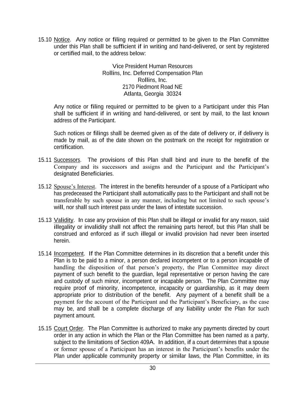 30 15.10 Notice. Any notice or filing required or permitted to be given to the Plan Committee under this Plan shall be sufficient if in writing and hand-delivered, or sent by registered or certified mail, to the address below: Vice President Human Resources Rollins, Inc. Deferred Compensation Plan Rollins, Inc. 2170 Piedmont Road NE Atlanta, Georgia 30324 Any notice or filing required or permitted to be given to a Participant under this Plan shall be sufficient if in writing and hand-delivered, or sent by mail, to the last known address of the Participant. Such notices or filings shall be deemed given as of the date of delivery or, if delivery is made by mail, as of the date shown on the postmark on the receipt for registration or certification. 15.11 Successors. The provisions of this Plan shall bind and inure to the benefit of the Company and its successors and assigns and the Participant and the Participant’s designated Beneficiaries. 15.12 Spouse’s Interest. The interest in the benefits hereunder of a spouse of a Participant who has predeceased the Participant shall automatically pass to the Participant and shall not be transferable by such spouse in any manner, including but not limited to such spouse’s will, nor shall such interest pass under the laws of intestate succession. 15.13 Validity. In case any provision of this Plan shall be illegal or invalid for any reason, said illegality or invalidity shall not affect the remaining parts hereof, but this Plan shall be construed and enforced as if such illegal or invalid provision had never been inserted herein. 15.14 Incompetent. If the Plan Committee determines in its discretion that a benefit under this Plan is to be paid to a minor, a person declared incompetent or to a person incapable of handling the disposition of that person’s property, the Plan Committee may direct payment of such benefit to the guardian, legal representative or person having the care and custody of such minor, incompetent or incapable person. The Plan Committee may require proof of minority, incompetence, incapacity or guardianship, as it may deem appropriate prior to distribution of the benefit. Any payment of a benefit shall be a payment for the account of the Participant and the Participant’s Beneficiary, as the case may be, and shall be a complete discharge of any liability under the Plan for such payment amount. 15.15 Court Order. The Plan Committee is authorized to make any payments directed by court order in any action in which the Plan or the Plan Committee has been named as a party, subject to the limitations of Section 409A. In addition, if a court determines that a spouse or former spouse of a Participant has an interest in the Participant’s benefits under the Plan under applicable community property or similar laws, the Plan Committee, in its