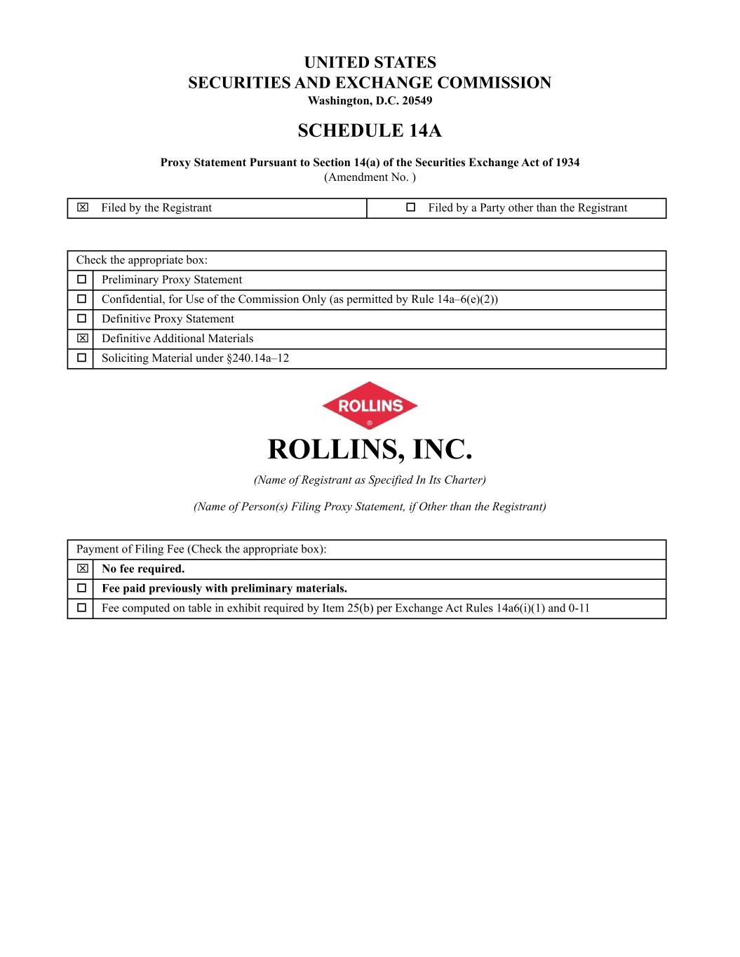 UNITED STATES SECURITIES AND EXCHANGE COMMISSION Washington, D.C. 20549 SCHEDULE 14A Proxy Statement Pursuant to Section 14(a) of the Securities Exchange Act of 1934 (Amendment No. ) Filed by the Registrant Filed by a Party other than the Registrant Check the appropriate box: Preliminary Proxy Statement Confidential, for Use of the Commission Only (as permitted by Rule 14a–6(e)(2)) Definitive Proxy Statement Definitive Additional Materials Soliciting Material under §240.14a–12 ROLLINS, INC. (Name of Registrant as Specified In Its Charter) (Name of Person(s) Filing Proxy Statement, if Other than the Registrant) Payment of Filing Fee (Check the appropriate box): No fee required. Fee paid previously with preliminary materials. Fee computed on table in exhibit required by Item 25(b) per Exchange Act Rules 14a6(i)(1) and 0-11