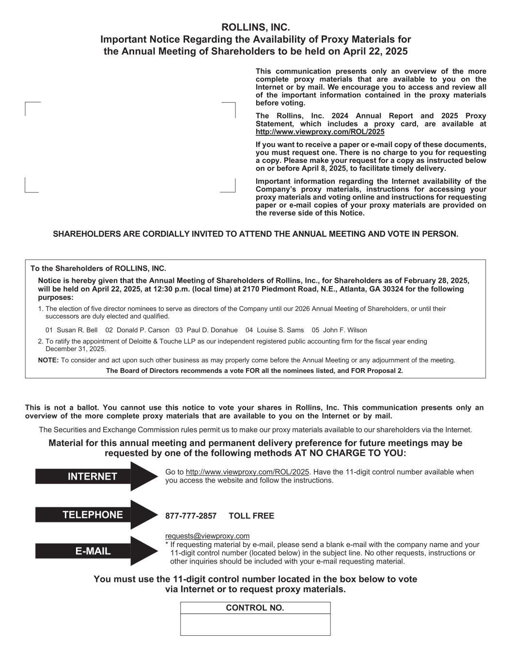 To the Shareholders of ROLLINS, INC. Notice is hereby given that the Annual Meeting of Shareholders of Rollins, Inc., for Shareholders as of February 28, 2025, will be held on April 22, 2025, at 12:30 p.m. (local time) at 2170 Piedmont Road, N.E., Atlanta, GA 30324 for the following purposes: 1. The election of five director nominees to serve as directors of the Company until our 2026 Annual Meeting of Shareholders, or until their successors are duly elected and qualified. 01 Susan R. Bell 02 Donald P. Carson 03 Paul D. Donahue 04 Louise S. Sams 05 John F. Wilson 2. To ratify the appointment of Deloitte & Touche LLP as our independent registered public accounting firm for the fiscal year ending December 31, 2025. NOTE: To consider and act upon such other business as may properly come before the Annual Meeting or any adjournment of the meeting. The Board of Directors recommends a vote FOR all the nominees listed, and FOR Proposal 2. CONTROL NO. ROLLINS, INC. Important Notice Regarding the Availability of Proxy Materials for the Annual Meeting of Shareholders to be held on April 22, 2025 This communication presents only an overview of the more complete proxy materials that are available to you on the Internet or by mail. We encourage you to access and review all of the important information contained in the proxy materials before voting. The Rollins, Inc. 2024 Annual Report and 2025 Proxy Statement, which includes a proxy card, are available at http://www.viewproxy.com/ROL/2025 If you want to receive a paper or e-mail copy of these documents, you must request one. There is no charge to you for requesting a copy. Please make your request for a copy as instructed below on or before April 8, 2025, to facilitate timely delivery. Important information regarding the Internet availability of the Company’s proxy materials, instructions for accessing your proxy materials and voting online and instructions for requesting paper or e-mail copies of your proxy materials are provided on the reverse side of this Notice. SHAREHOLDERS ARE CORDIALLY INVITED TO ATTEND THE ANNUAL MEETING AND VOTE IN PERSON. This is not a ballot. You cannot use this notice to vote your shares in Rollins, Inc. This communication presents only an overview of the more complete proxy materials that are available to you on the Internet or by mail. The Securities and Exchange Commission rules permit us to make our proxy materials available to our shareholders via the Internet. Material for this annual meeting and permanent delivery preference for future meetings may be requested by one of the following methods AT NO CHARGE TO YOU: Go to http://www.viewproxy.com/ROL/2025. Have the 11-digit control number available when you access the website and follow the instructions. 877-777-2857 TOLL FREE requests@viewproxy.com * If requesting material by e-mail, please send a blank e-mail with the company name and your 11-digit control number (located below) in the subject line. No other requests, instructions or other inquiries should be included with your e-mail requesting material. You must use the 11-digit control number located in the box below to vote via Internet or to request proxy materials. INTERNET TELEPHONE