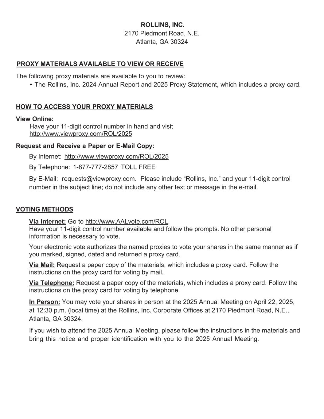 ROLLINS, INC. 2170 Piedmont Road, N.E. Atlanta, GA 30324 PROXY MATERIALS AVAILABLE TO VIEW OR RECEIVE The following proxy materials are available to you to review: • The Rollins, Inc. 2024 Annual Report and 2025 Proxy Statement, which includes a proxy card. HOW TO ACCESS YOUR PROXY MATERIALS View Online: Have your 11-digit control number in hand and visit http://www.viewproxy.com/ROL/2025 Request and Receive a Paper or E-Mail Copy: By Internet: http://www.viewproxy.com/ROL/2025 By Telephone: 1-877-777-2857 TOLL FREE By E-Mail: requests@viewproxy.com. Please include “Rollins, Inc.” and your 11-digit control number in the subject line; do not include any other text or message in the e-mail. VOTING METHODS Via Internet: Go to http://www.AALvote.com/ROL. Have your 11-digit control number available and follow the prompts. No other personal information is necessary to vote. Your electronic vote authorizes the named proxies to vote your shares in the same manner as if you marked, signed, dated and returned a proxy card. Via Mail: Request a paper copy of the materials, which includes a proxy card. Follow the instructions on the proxy card for voting by mail. Via Telephone: Request a paper copy of the materials, which includes a proxy card. Follow the instructions on the proxy card for voting by telephone. In Person: You may vote your shares in person at the 2025 Annual Meeting on April 22, 2025, at 12:30 p.m. (local time) at the Rollins, Inc. Corporate Offices at 2170 Piedmont Road, N.E., Atlanta, GA 30324. If you wish to attend the 2025 Annual Meeting, please follow the instructions in the materials and bring this notice and proper identification with you to the 2025 Annual Meeting.