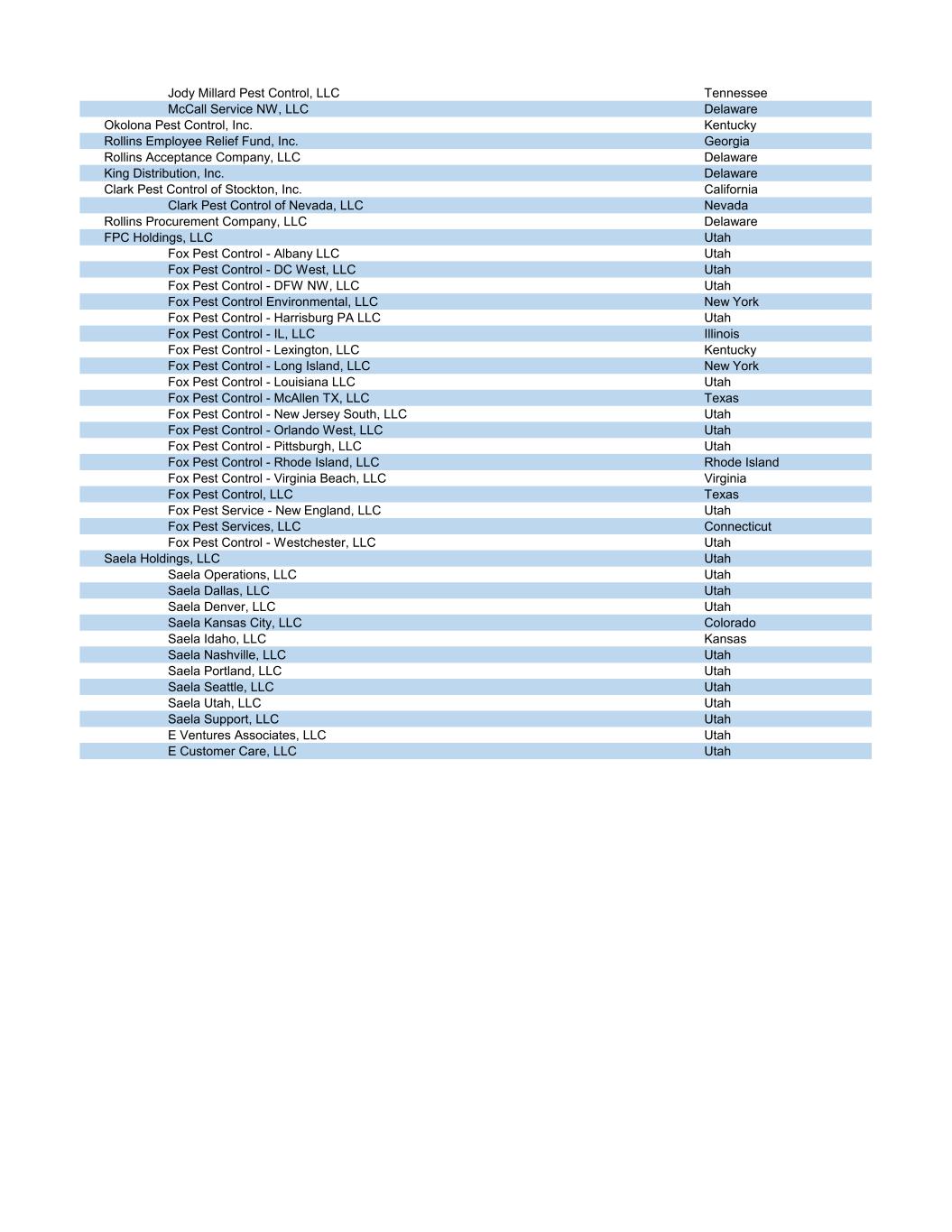 Jody Millard Pest Control, LLC Tennessee McCall Service NW, LLC Delaware Okolona Pest Control, Inc. Kentucky Rollins Employee Relief Fund, Inc. Georgia Rollins Acceptance Company, LLC Delaware King Distribution, Inc. Delaware Clark Pest Control of Stockton, Inc. California Clark Pest Control of Nevada, LLC Nevada Rollins Procurement Company, LLC Delaware FPC Holdings, LLC Utah Fox Pest Control - Albany LLC Utah Fox Pest Control - DC West, LLC Utah Fox Pest Control - DFW NW, LLC Utah Fox Pest Control Environmental, LLC New York Fox Pest Control - Harrisburg PA LLC Utah Fox Pest Control - IL, LLC Illinois Fox Pest Control - Lexington, LLC Kentucky Fox Pest Control - Long Island, LLC New York Fox Pest Control - Louisiana LLC Utah Fox Pest Control - McAllen TX, LLC Texas Fox Pest Control - New Jersey South, LLC Utah Fox Pest Control - Orlando West, LLC Utah Fox Pest Control - Pittsburgh, LLC Utah Fox Pest Control - Rhode Island, LLC Rhode Island Fox Pest Control - Virginia Beach, LLC Virginia Fox Pest Control, LLC Texas Fox Pest Service - New England, LLC Utah Fox Pest Services, LLC Connecticut Fox Pest Control - Westchester, LLC Utah Saela Holdings, LLC Utah Saela Operations, LLC Utah Saela Dallas, LLC Utah Saela Denver, LLC Utah Saela Kansas City, LLC Colorado Saela Idaho, LLC Kansas Saela Nashville, LLC Utah Saela Portland, LLC Utah Saela Seattle, LLC Utah Saela Utah, LLC Utah Saela Support, LLC Utah E Ventures Associates, LLC Utah E Customer Care, LLC Utah
