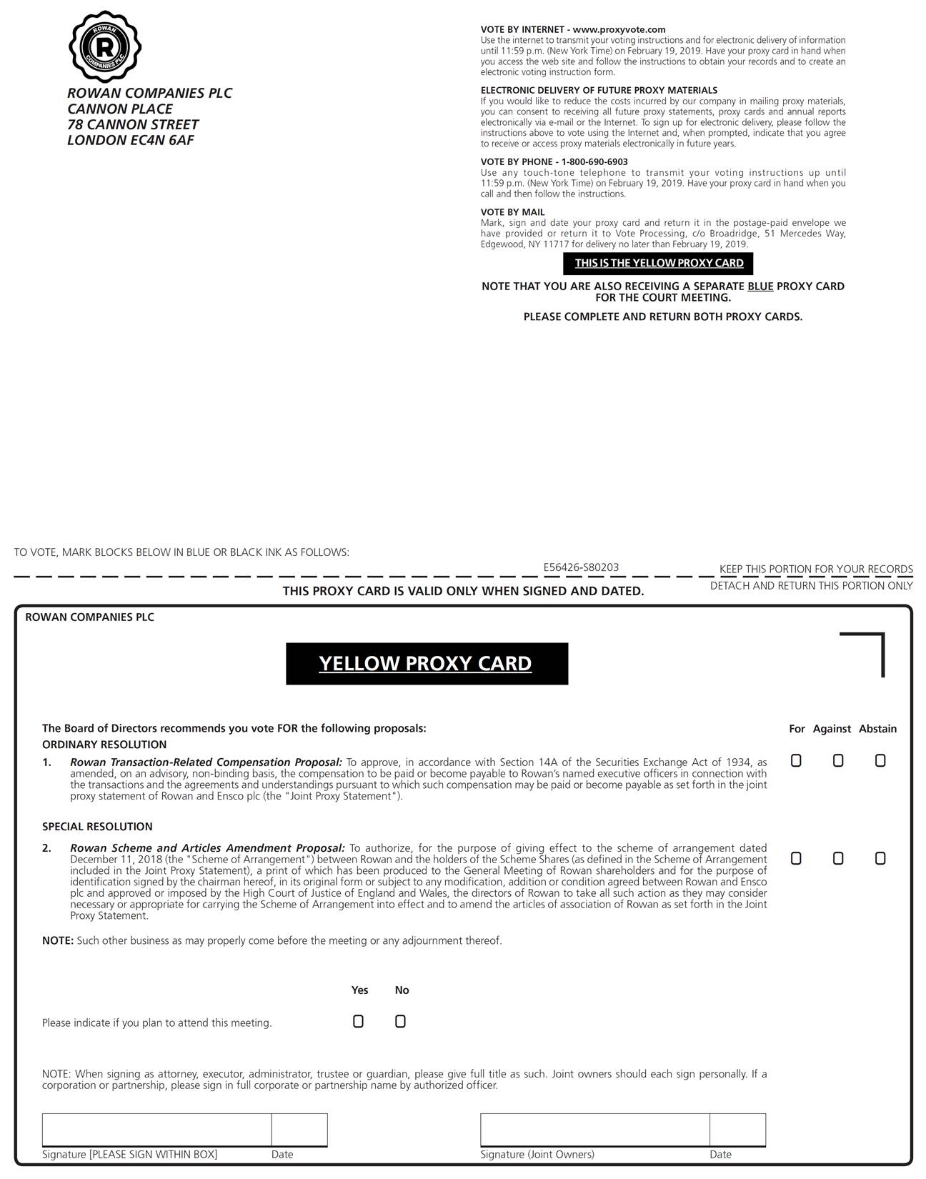 VOTE BY INTERNET - www.proxyvote.com Use the internet to transmit your voting instructions and for electronic delivery of information until 11:59 p.m. (New York Time) on February 19, 2019. Have your proxy card in hand when you access the web site and follow the instructions to obtain your records and to create an electronic voting instruction form. ELECTRONIC DELIVERY OF FUTURE PROXY MATERIALS If you would like to reduce the costs incurred by our company in mailing proxy materials, you can consent to receiving all future proxy statements, proxy cards and annual reports electronically via e-mail or the Internet. To sign up for electronic delivery, please follow the instructions above to vote using the Internet and, when prompted, indicate that you agree to receive or access proxy materials electronically in future years. VOTE BY PHONE - 1-800-690-6903 Use any touch-tone telephone to transmit your voting instructions up until 11:59 p.m. (New York Time) on February 19, 2019. Have your proxy card in hand when you call and then follow the instructions. VOTE BY MAIL Mark, sign and date your proxy card and return it in the postage-paid envelope we have provided or return it to Vote Processing, c/o Broadridge, 51 Mercedes Way, Edgewood, NY 11717 for delivery no later than February 19, 2019. ROWAN COMPANIES PLC CANNON PLACE 78 CANNON STREET LONDON EC4N 6AF NOTE THAT YOU ARE ALSO RECEIVING A SEPARATE BLUE PROXY CARD FOR THE COURT MEETING. PLEASE COMPLETE AND RETURN BOTH PROXY CARDS. TO VOTE, MARK BLOCKS BELOW IN BLUE OR BLACK INK AS FOLLOWS: E56426-S80203 KEEP THIS PORTION FOR YOUR RECORDS DETACH AND RETURN THIS PORTION ONLY THIS PROXY CARD IS VALID ONLY WHEN SIGNED AND DATED. ROWAN COMPANIES PLC The Board of Directors recommends you vote FOR the following proposals: ORDINARY RESOLUTION For Against Abstain ! ! ! 1. Rowan Transaction-Related Compensation Proposal: To approve, in accordance with Section 14A of the Securities Exchange Act of 1934, as amended, on an advisory, non-binding basis, the compensation to be paid or become payable to Rowan’s named executive officers in connection with the transactions and the agreements and understandings pursuant to which such compensation may be paid or become payable as set forth in the joint proxy statement of Rowan and Ensco plc (the "Joint Proxy Statement"). SPECIAL RESOLUTION 2. Rowan Scheme and Articles Amendment Proposal: To authorize, for the purpose of giving effect to the scheme of arrangement dated December 11, 2018 (the "Scheme of Arrangement") between Rowan and the holders of the Scheme Shares (as defined in the Scheme of Arrangement included in the Joint Proxy Statement), a print of which has been produced to the General Meeting of Rowan shareholders and for the purpose of identification signed by the chairman hereof, in its original form or subject to any modification, addition or condition agreed between Rowan and Ensco plc and approved or imposed by the High Court of Justice of England and Wales, the directors of Rowan to take all such action as they may consider necessary or appropriate for carrying the Scheme of Arrangement into effect and to amend the articles of association of Rowan as set forth in the Joint Proxy Statement. ! ! ! NOTE: Such other business as may properly come before the meeting or any adjournment thereof. Yes No ! ! Please indicate if you plan to attend this meeting. NOTE: When signing as attorney, executor, administrator, trustee or guardian, please give full title as such. Joint owners should each sign personally. If a corporation or partnership, please sign in full corporate or partnership name by authorized officer. Signature [PLEASE SIGN WITHIN BOX] Date Signature (Joint Owners) Date YELLOW PROXY CARD THIS IS THE YELLOW PROXY CARD