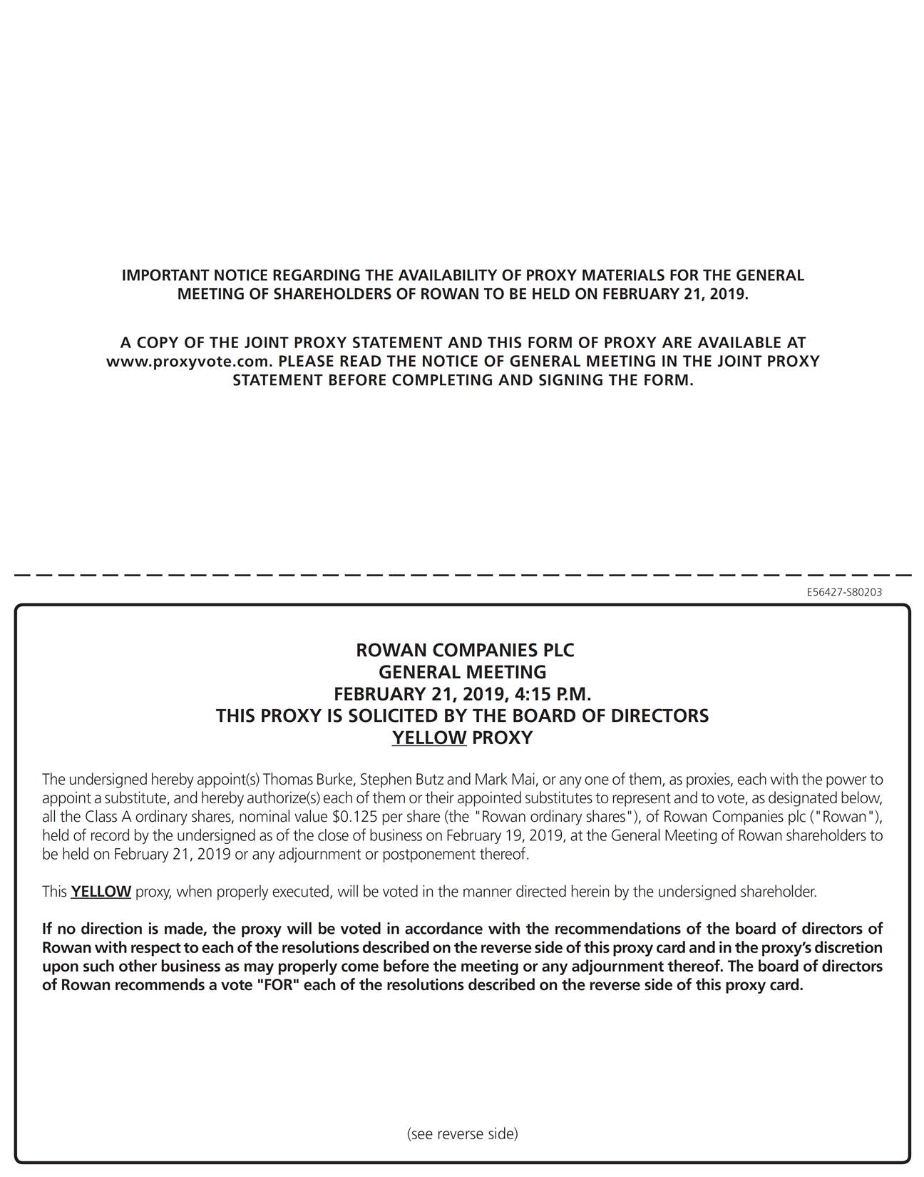 IMPORTANT NOTICE REGARDING THE AVAILABILITY OF PROXY MATERIALS FOR THE GENERAL MEETING OF SHAREHOLDERS OF ROWAN TO BE HELD ON FEBRUARY 21, 2019. A COPY OF THE JOINT PROXY STATEMENT AND THIS FORM OF PROXY ARE AVAILABLE AT www.proxyvote.com. PLEASE READ THE NOTICE OF GENERAL MEETING IN THE JOINT PROXY STATEMENT BEFORE COMPLETING AND SIGNING THE FORM. E56427-S80203 ROWAN COMPANIES PLC GENERAL MEETING FEBRUARY 21, 2019, 4:15 P.M. THIS PROXY IS SOLICITED BY THE BOARD OF DIRECTORS YELLOW PROXY The undersigned hereby appoint(s) Thomas Burke, Stephen Butz and Mark Mai, or any one of them, as proxies, each with the power to appoint a substitute, and hereby authorize(s) each of them or their appointed substitutes to represent and to vote, as designated below, all the Class A ordinary shares, nominal value $0.125 per share (the "Rowan ordinary shares"), of Rowan Companies plc ("Rowan"), held of record by the undersigned as of the close of business on February 19, 2019, at the General Meeting of Rowan shareholders to be held on February 21, 2019 or any adjournment or postponement thereof. This YELLOW proxy, when properly executed, will be voted in the manner directed herein by the undersigned shareholder. If no direction is made, the proxy will be voted in accordance with the recommendations of the board of directors of Rowan with respect to each of the resolutions described on the reverse side of this proxy card and in the proxy’s discretion upon such other business as may properly come before the meeting or any adjournment thereof. The board of directors of Rowan recommends a vote "FOR" each of the resolutions described on the reverse side of this proxy card. (see reverse side)