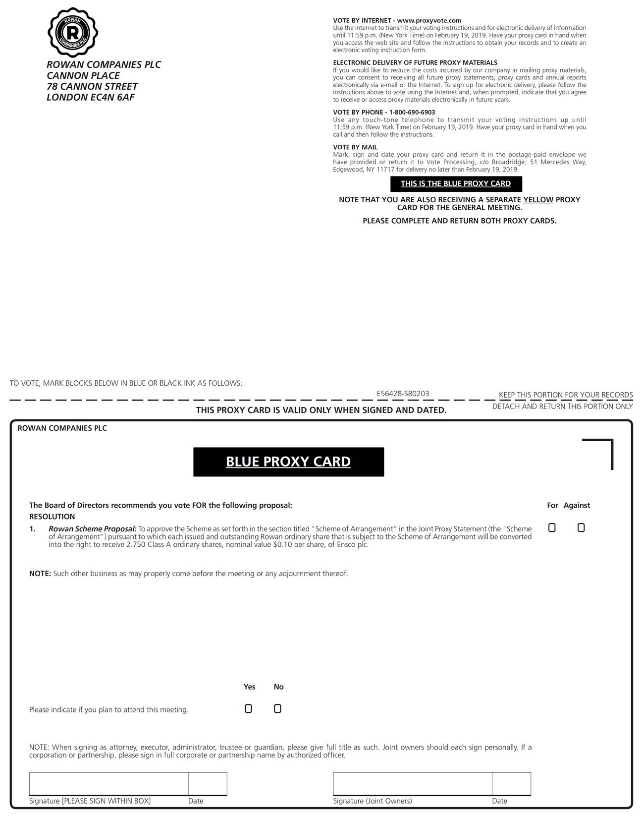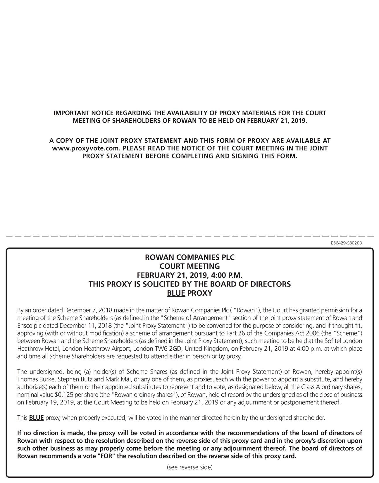 IMPORTANT NOTICE REGARDING THE AVAILABILITY OF PROXY MATERIALS FOR THE COURT MEETING OF SHAREHOLDERS OF ROWAN TO BE HELD ON FEBRUARY 21, 2019. A COPY OF THE JOINT PROXY STATEMENT AND THIS FORM OF PROXY ARE AVAILABLE AT www.proxyvote.com. PLEASE READ THE NOTICE OF THE COURT MEETING IN THE JOINT PROXY STATEMENT BEFORE COMPLETING AND SIGNING THIS FORM. E56429-S80203 ROWAN COMPANIES PLC COURT MEETING FEBRUARY 21, 2019, 4:00 P.M. THIS PROXY IS SOLICITED BY THE BOARD OF DIRECTORS BLUE PROXY By an order dated December 7, 2018 made in the matter of Rowan Companies Plc ( "Rowan"), the Court has granted permission for a meeting of the Scheme Shareholders (as defined in the "Scheme of Arrangement" section of the joint proxy statement of Rowan and Ensco plc dated December 11, 2018 (the "Joint Proxy Statement") to be convened for the purpose of considering, and if thought fit, approving (with or without modification) a scheme of arrangement pursuant to Part 26 of the Companies Act 2006 (the "Scheme") between Rowan and the Scheme Shareholders (as defined in the Joint Proxy Statement), such meeting to be held at the Sofitel London Heathrow Hotel, London Heathrow Airport, London TW6 2GD, United Kingdom, on February 21, 2019 at 4:00 p.m. at which place and time all Scheme Shareholders are requested to attend either in person or by proxy. The undersigned, being (a) holder(s) of Scheme Shares (as defined in the Joint Proxy Statement) of Rowan, hereby appoint(s) Thomas Burke, Stephen Butz and Mark Mai, or any one of them, as proxies, each with the power to appoint a substitute, and hereby authorize(s) each of them or their appointed substitutes to represent and to vote, as designated below, all the Class A ordinary shares, nominal value $0.125 per share (the "Rowan ordinary shares"), of Rowan, held of record by the undersigned as of the close of business on February 19, 2019, at the Court Meeting to be held on February 21, 2019 or any adjournment or postponement thereof. This BLUE proxy, when properly executed, will be voted in the manner directed herein by the undersigned shareholder. If no direction is made, the proxy will be voted in accordance with the recommendations of the board of directors of Rowan with respect to the resolution described on the reverse side of this proxy card and in the proxy’s discretion upon such other business as may properly come before the meeting or any adjournment thereof. The board of directors of Rowan recommends a vote "FOR" the resolution described on the reverse side of this proxy card. (see reverse side)
