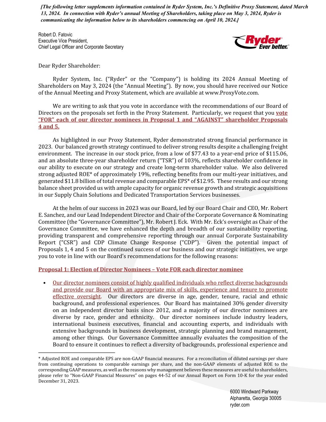 [The following letter supplements information contained in Ryder System, Inc.’s Definitive Proxy Statement, dated March 13, 2024. In connection with Ryder’s annual Meeting of Shareholders, taking place on May 3, 2024, Ryder is communicating the information below to its shareholders commencing on April 10, 2024.] Robert D. Fatovic Executive Vice President, Chief Legal Officer and Corporate Secretary 6000 Windward Parkway Alpharetta, Georgia 30005 ryder.com Dear Ryder Shareholder: Ryder System, Inc. (“Ryder” or the “Company”) is holding its 2024 Annual Meeting of Shareholders on May 3, 2024 (the “Annual Meeting”). By now, you should have received our Notice of the Annual Meeting and Proxy Statement, which are available at www.ProxyVote.com. We are writing to ask that you vote in accordance with the recommendations of our Board of Directors on the proposals set forth in the Proxy Statement. Particularly, we request that you vote “FOR” each of our director nominees in Proposal 1 and “AGAINST” shareholder Proposals 4 and 5. As highlighted in our Proxy Statement, Ryder demonstrated strong financial performance in 2023. Our balanced growth strategy continued to deliver strong results despite a challenging freight environment. The increase in our stock price, from a low of $77.43 to a year-end price of $115.06, and an absolute three-year shareholder return (“TSR”) of 103%, reflects shareholder confidence in our ability to execute on our strategy and create long-term shareholder value. We also delivered strong adjusted ROE* of approximately 19%, reflecting benefits from our multi-year initiatives, and generated $11.8 billion of total revenue and comparable EPS* of $12.95. These results and our strong balance sheet provided us with ample capacity for organic revenue growth and strategic acquisitions in our Supply Chain Solutions and Dedicated Transportation Services businesses. At the helm of our success in 2023 was our Board, led by our Board Chair and CEO, Mr. Robert E. Sanchez, and our Lead Independent Director and Chair of the Corporate Governance & Nominating Committee (the “Governance Committee”), Mr. Robert J. Eck. With Mr. Eck’s oversight as Chair of the Governance Committee, we have enhanced the depth and breadth of our sustainability reporting, providing transparent and comprehensive reporting through our annual Corporate Sustainability Report (“CSR”) and CDP Climate Change Response (“CDP”). Given the potential impact of Proposals 1, 4 and 5 on the continued success of our business and our strategic initiatives, we urge you to vote in line with our Board’s recommendations for the following reasons: Proposal 1: Election of Director Nominees – Vote FOR each director nominee • Our director nominees consist of highly qualified individuals who reflect diverse backgrounds and provide our Board with an appropriate mix of skills, experience and tenure to promote effective oversight. Our directors are diverse in age, gender, tenure, racial and ethnic background, and professional experiences. Our Board has maintained 30% gender diversity on an independent director basis since 2012, and a majority of our director nominees are diverse by race, gender and ethnicity. Our director nominees include industry leaders, international business executives, financial and accounting experts, and individuals with extensive backgrounds in business development, strategic planning and brand management, among other things. Our Governance Committee annually evaluates the composition of the Board to ensure it continues to reflect a diversity of backgrounds, professional experience and * Adjusted ROE and comparable EPS are non-GAAP financial measures. For a reconciliation of diluted earnings per share from continuing operations to comparable earnings per share, and the non-GAAP elements of adjusted ROE to the corresponding GAAP measures, as well as the reasons why management believes these measures are useful to shareholders, please refer to “Non-GAAP Financial Measures” on pages 44-52 of our Annual Report on Form 10-K for the year ended December 31, 2023.