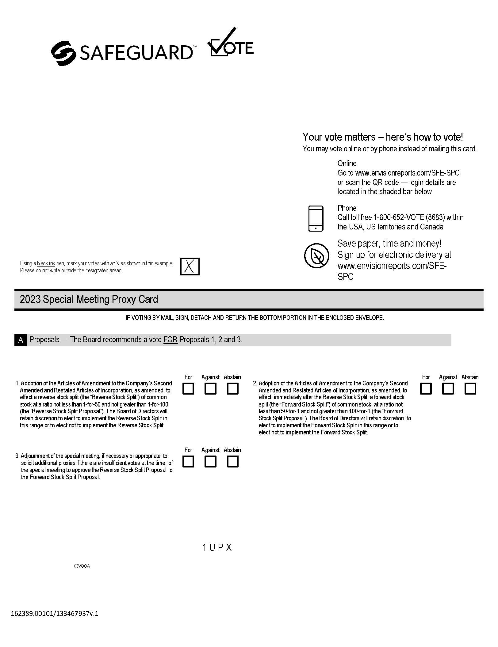 The primary purpose of the Stock Splits is to enable Safeguard to reduce the number of record holders of its common stock below 300, which is the level at or above which Safeguard is required to file public reports with the Securities and Exchange Commission (the “SEC”). As described in the accompanying proxy statement, the Board will consider various factors in determining the Stock Split Ratios; however, Safeguard believes that any Reverse Stock Split Ratio within the proposed range would reduce the number of record holders below 300. The Stock Splits are being undertaken as part of the Company’s plan to suspend its duty to file periodic and current reports and other information with the SEC under the Securities Exchange Act of 1934, as amended (the “Exchange Act”). As described in the accompanying proxy statement, the Board has determined that the costs of being a public reporting company outweigh the benefits thereof. The actions we would take to suspend, and events that occur as a result of such actions that would have the effect of suspending, our reporting obligations under the Exchange Act, also referred to as the “going dark” transaction, including effectuating the Stock Splits, delisting our common stock from trading on The Nasdaq Stock Market LLC, terminating the registration of our common stock under Sections 12(b) and 12(g) of the Exchange Act and suspending of our reporting obligations under Section 15(d) of the Exchange Act, are collectively referred to as the “Transaction”.