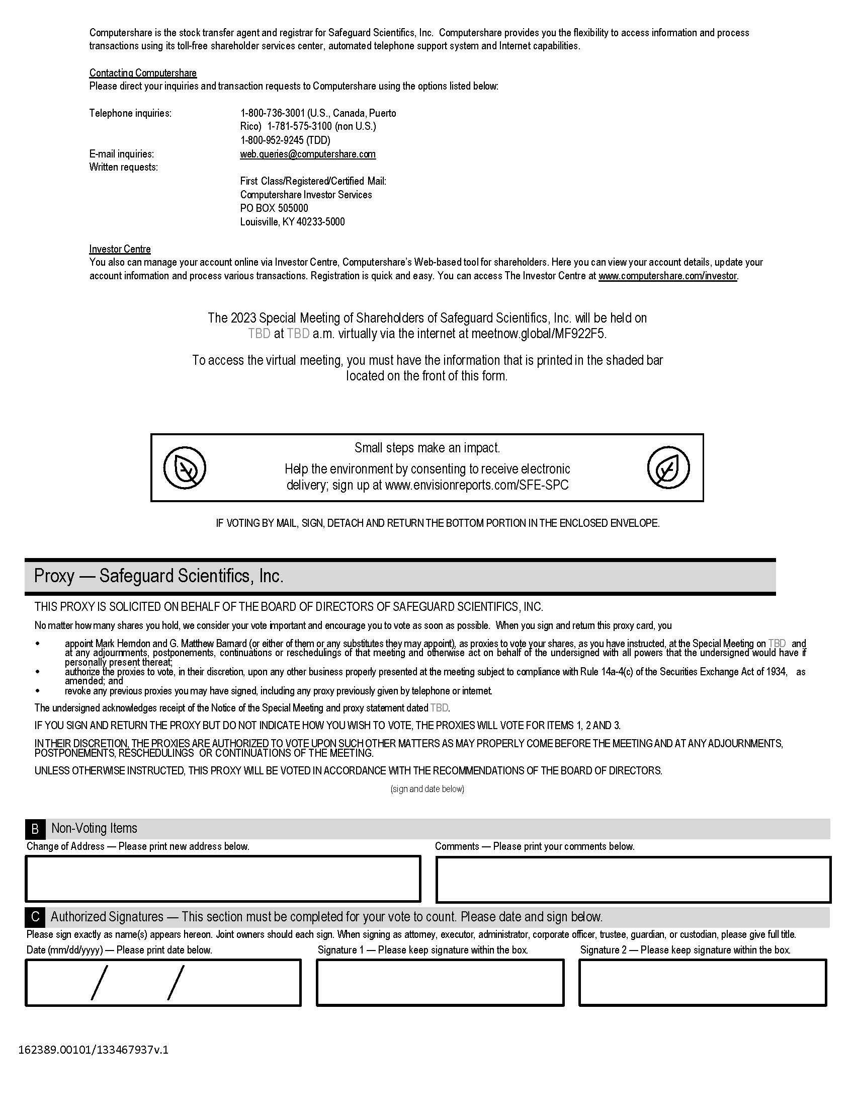 You are invited to attend the Special Meeting of Shareholders of Safeguard Scientifics, Inc. This special meeting will be conducted solely as a virtual meeting over the Internet. You will be able to attend our special meeting via live webcast by visiting: meetnow.global/MF922F5 and entering the control number included in: (i) the Notice of Internet availability of our proxy materials or (ii) other proxy materials that will be mailed to shareholders on or about [●], 2023. Please see the “Questions and Answers About the Special Meeting and the Stock Splits to Effect the Transaction” section below for detailed instructions regarding the agenda of, and attendance at, this special meeting.