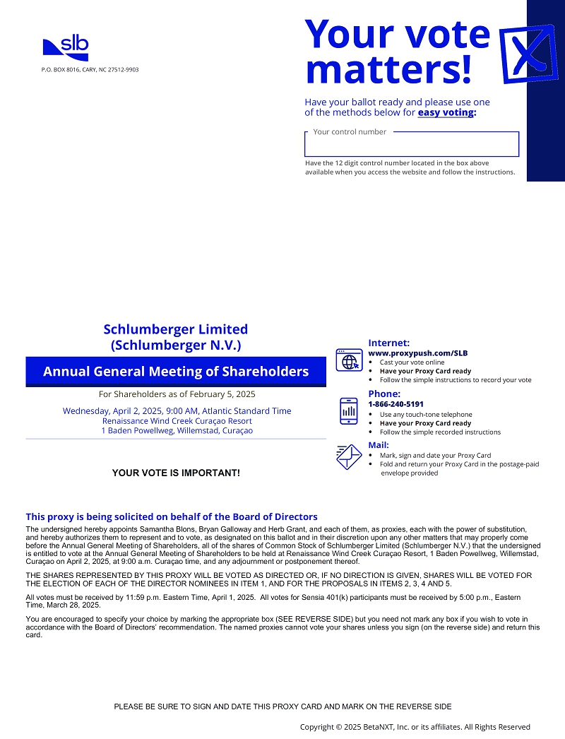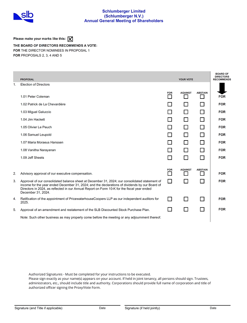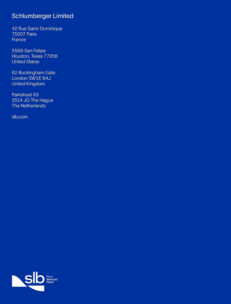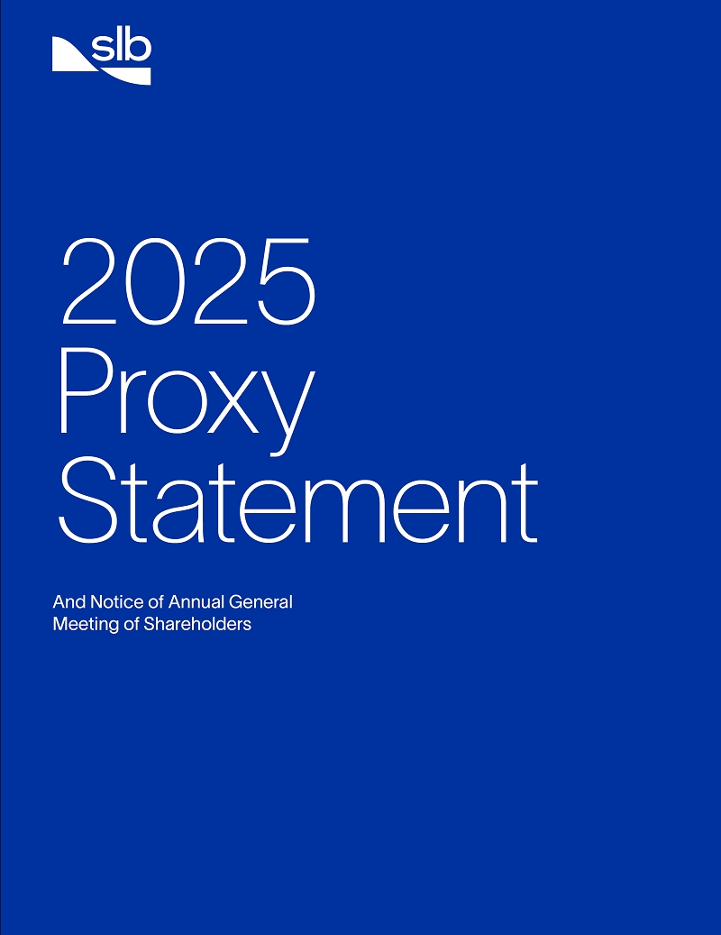 This proxy statement includes forward-looking statements within the meaning of the Private Securities Litigation Reform Act of 1995. All statements other than statements of historical or current facts made in this document are forward-looking. We use words such as anticipates, believes, expects, future, intends, goal, target, ambition, commitment, will, and similar expressions to identify forward-looking statements. Forward-looking statements reflect management’s current expectations and are inherently uncertain, and actual results or outcomes could differ materially for a variety of reasons. Risks and uncertainties that could cause our actual results to differ significantly from management’s expectations include, but are not limited to, changing global economic and geopolitical conditions; changes in exploration and production spending by SLB’s customers and changes in the level of oil and natural gas exploration and development; the results of operations and financial condition of SLB’s customers and suppliers; SLB’s inability to achieve its financial and performance targets and other forecasts and expectations; SLB’s inability to achieve net-zero carbon emissions goals or interim emissions reduction goals; general economic, geopolitical, and business conditions in key regions of the world; the ongoing conflict in Ukraine; foreign currency risk; inflation; changes in monetary policy by governments; tariffs; pricing pressure; weather and seasonal factors; unfavorable effects of health pandemics; availability and cost of raw materials; operational modifications, delays, or cancellations; challenges in SLB’s supply chain; production declines; the extent of future charges; SLB’s inability to recognize efficiencies and other intended benefits from its business strategies and initiatives, such as digital or new energy, as well as its cost reduction strategies; changes in government regulations and regulatory requirements, including those related to offshore oil and gas exploration, radioactive sources, explosives, chemicals, and climate-related initiatives; the inability of technology to meet new challenges in exploration; the competitiveness of alternative energy sources or product substitutes; and other risks and uncertainties detailed in SLB’s Annual Report on Form 10-K for the fiscal year ended December 31, 2024 (2024 Annual Report), and other filings that we make with the SEC.