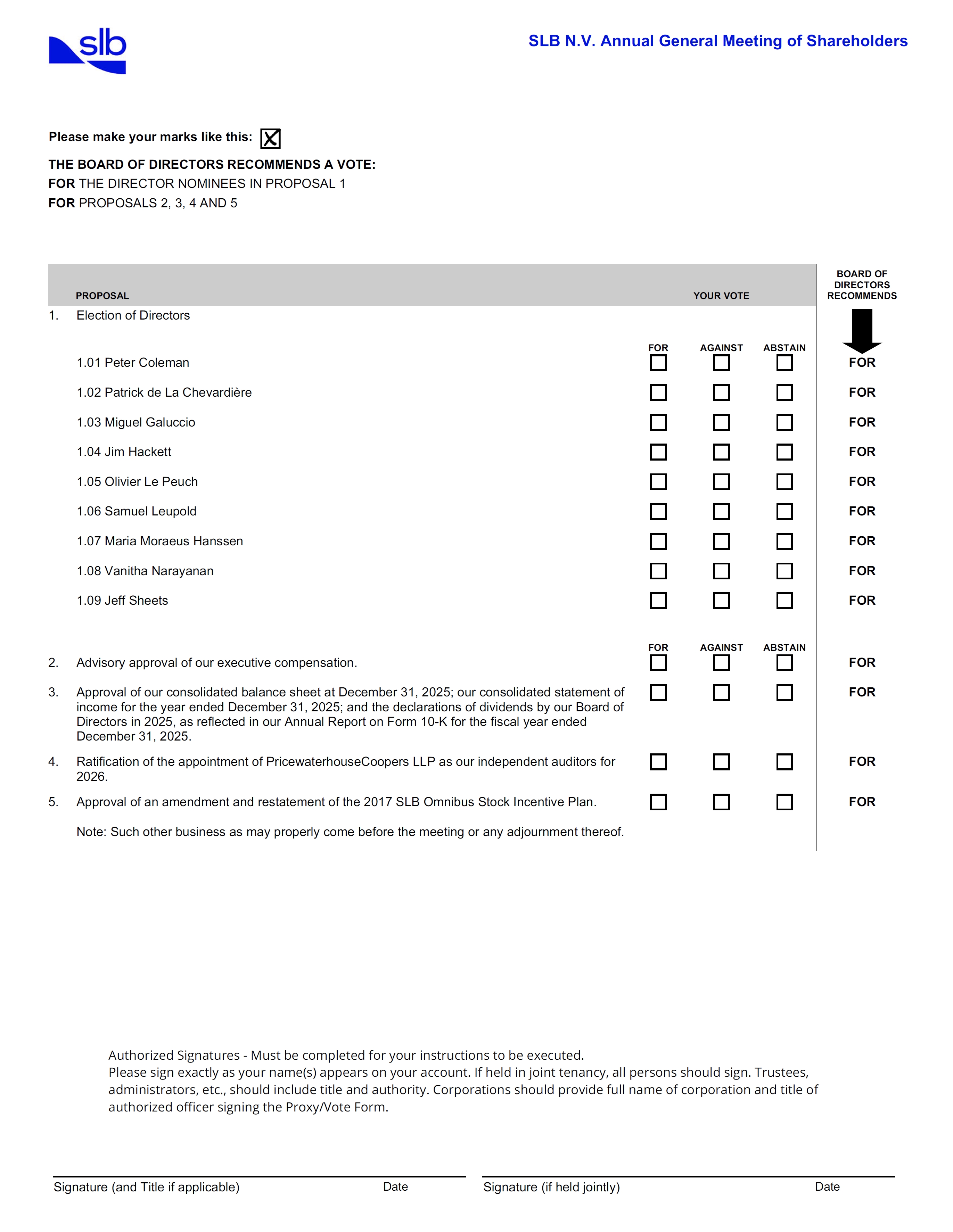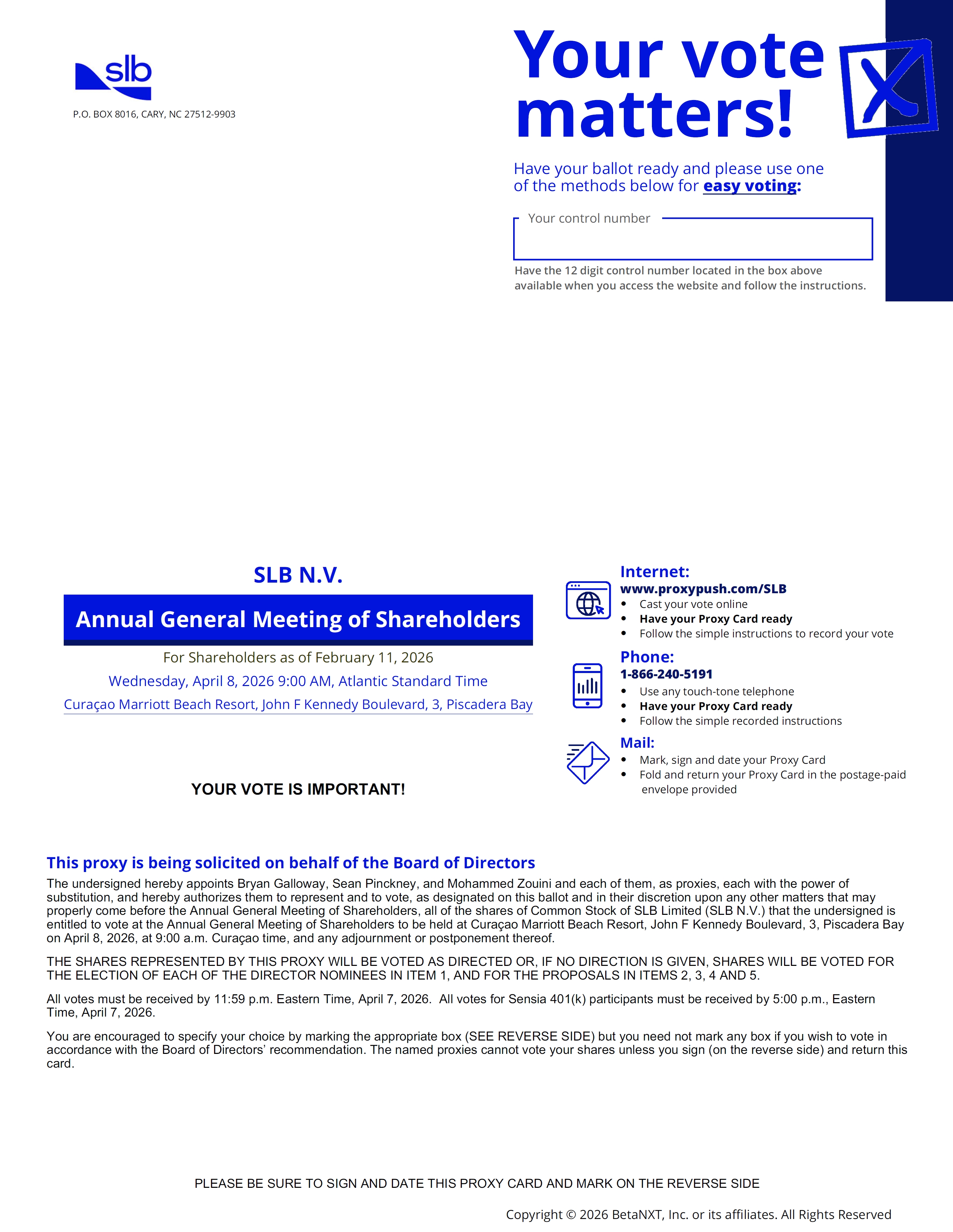 Please refer to the enclosed proxy materials or to the information forwarded by your bank, broker, or other nominee to determine which voting methods are available to you. Shareholders with shares registered in their names with SLB’s transfer agent may authorize a proxy:
