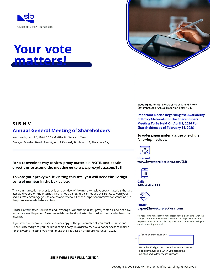 P.O. BOX 8016, CARY, NC 27512-9903 Your vote matters! SLB N.V. Annual General Meeting of Shareholders Wednesday, April 8, 2026 9:00 AM, Atlantic Standard Time Curaçao Marriott Beach Resort, John F Kennedy Boulevard, 3, Piscadera Bay For a convenient way to view proxy materials, VOTE, and obtain directions to attend the meeting go to www.proxydocs.com/SLB To vote your proxy while visiting this site, you will need the 12 digit control number in the box below. This communication presents only an overview of the more complete proxy materials that are available to you on the Internet. This is not a ballot. You cannot use this notice to vote your shares. We encourage you to access and review all of the important information contained in the proxy materials before voting. Under United States Securities and Exchange Commission rules, proxy materials do not have to be delivered in paper. Proxy materials can be distributed by making them available on the internet. If you want to receive a paper or e-mail copy of the proxy material, you must request one. There is no charge to you for requesting a copy. In order to receive a paper package in time for this year's meeting, you must make this request on or before March 31, 2026. Meeting Materials: Notice of Meeting and Proxy Statement, and Annual Report on Form 10-K Important Notice Regarding the Availability of Proxy Materials for the Shareholders Meeting To Be Held On April 8, 2026 For Shareholders as of February 11, 2026 To order paper materials, use one of the following methods. Internet: www.investorelections.com/SLB Call: 1-866-648-8133 Email: paper@investorelections.com * If requesting material by e-mail, please send a blank e-mail with the 12 digit control number (located below) in the subject line. No other requests, instructions OR other inquiries should be included with your e-mail requesting material. Your control number Have the 12 digit control number located in the box above available when you access the website and follow the instructions. SEE REVERSE FOR FULL AGENDA Copyright © 2026 BetaNXT, Inc. or its affiliates. All Rights Reserved