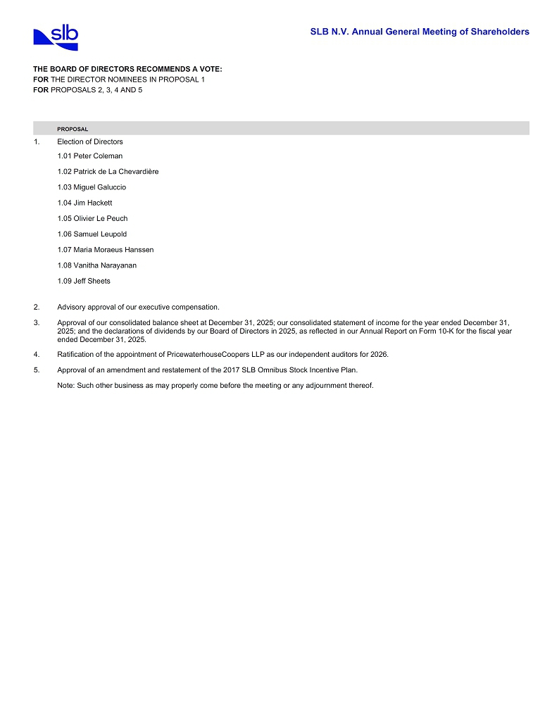 SLB N.V. Annual General Meeting of Shareholders THE BOARD OF DIRECTORS RECOMMENDS A VOTE: FOR THE DIRECTOR NOMINEES IN PROPOSAL 1 FOR PROPOSALS 2, 3, 4 AND 5 PROPOSAL 1. Election of Directors 1.01 Peter Coleman 1.02 Patrick de La Chevardière 1.03 Miguel Galuccio 1.04 Jim Hackett 1.05 Olivier Le Peuch 1.06 Samuel Leupold 1.07 Maria Moraeus Hanssen 1.08 Vanitha Narayanan 1.09 Jeff Sheets 2. Advisory approval of our executive compensation. 3. Approval of our consolidated balance sheet at December 31, 2025; our consolidated statement of income for the year ended December 31, 2025; and the declarations of dividends by our Board of Directors in 2025, as reflected in our Annual Report on Form 10-K for the fiscal year ended December 31, 2025. 4. Ratification of the appointment of PricewaterhouseCoopers LLP as our independent auditors for 2026. 5. Approval of an amendment and restatement of the 2017 SLB Omnibus Stock Incentive Plan. Note: Such other business as may properly come before the meeting or any adjournment thereof.
