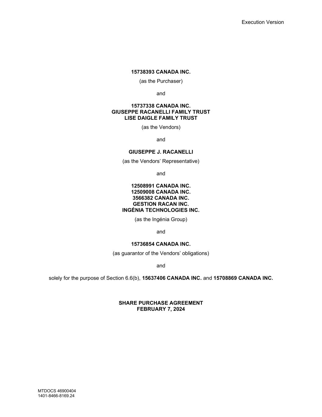 Execution Version MTDOCS 46900404 1401-8466-8169.24 15738393 CANADA INC. (as the Purchaser) and 15737338 CANADA INC. GIUSEPPE RACANELLI FAMILY TRUST LISE DAIGLE FAMILY TRUST (as the Vendors) and GIUSEPPE J. RACANELLI (as the Vendors’ Representative) and 12508991 CANADA INC. 12509008 CANADA INC. 3566382 CANADA INC. GESTION RACAN INC. INGÉNIA TECHNOLOGIES INC. (as the Ingénia Group) and 15736854 CANADA INC. (as guarantor of the Vendors’ obligations) and solely for the purpose of Section 6.6(b), 15637406 CANADA INC. and 15708869 CANADA INC. SHARE PURCHASE AGREEMENT FEBRUARY 7, 2024