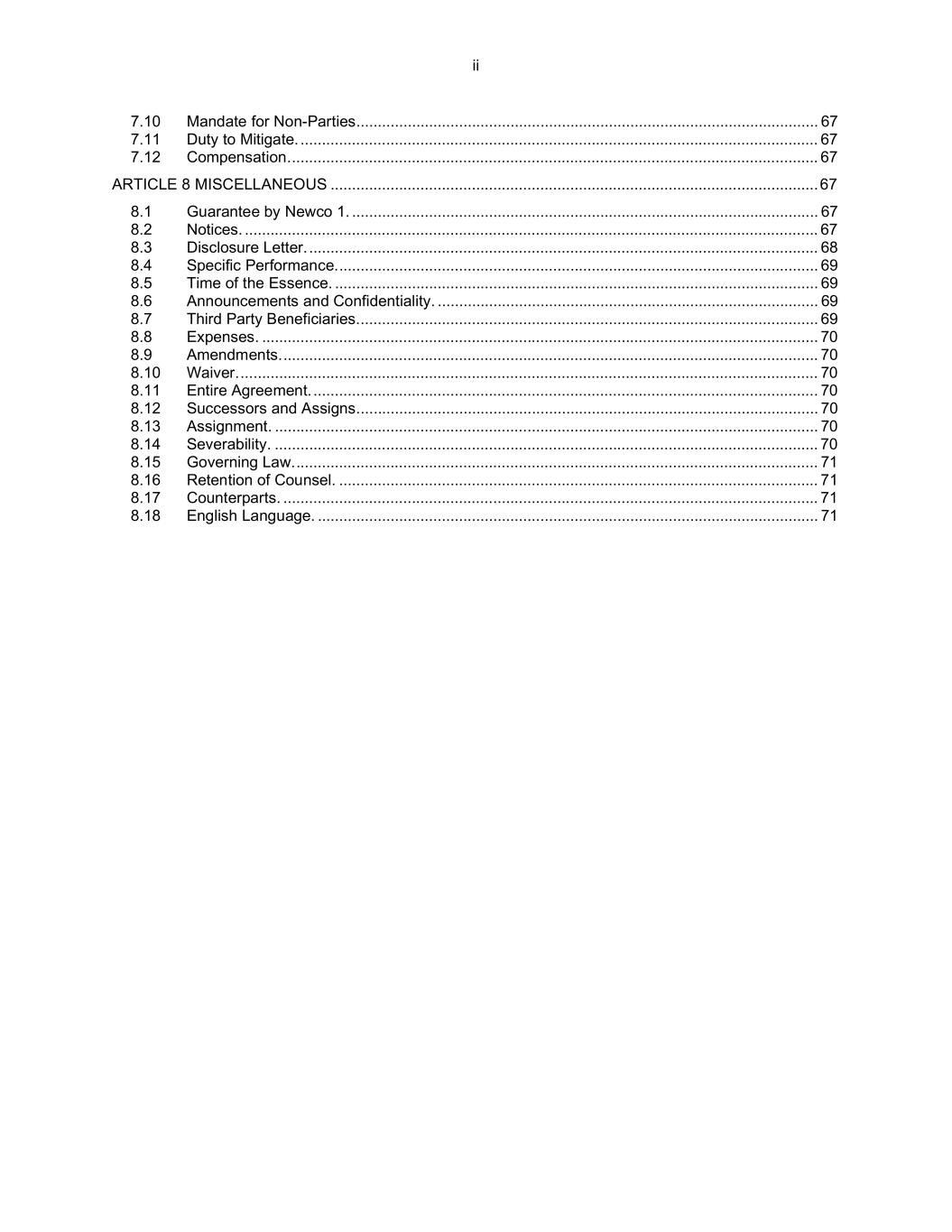 ii 7.10 Mandate for Non-Parties............................................................................................................ 67 7.11 Duty to Mitigate. ......................................................................................................................... 67 7.12 Compensation............................................................................................................................ 67 ARTICLE 8 MISCELLANEOUS ..................................................................................................................67 8.1 Guarantee by Newco 1. ............................................................................................................. 67 8.2 Notices. ...................................................................................................................................... 67 8.3 Disclosure Letter. ....................................................................................................................... 68 8.4 Specific Performance................................................................................................................. 69 8.5 Time of the Essence. ................................................................................................................. 69 8.6 Announcements and Confidentiality. ......................................................................................... 69 8.7 Third Party Beneficiaries............................................................................................................ 69 8.8 Expenses. .................................................................................................................................. 70 8.9 Amendments.............................................................................................................................. 70 8.10 Waiver........................................................................................................................................ 70 8.11 Entire Agreement. ...................................................................................................................... 70 8.12 Successors and Assigns............................................................................................................ 70 8.13 Assignment. ............................................................................................................................... 70 8.14 Severability. ............................................................................................................................... 70 8.15 Governing Law........................................................................................................................... 71 8.16 Retention of Counsel. ................................................................................................................ 71 8.17 Counterparts. ............................................................................................................................. 71 8.18 English Language. ..................................................................................................................... 71