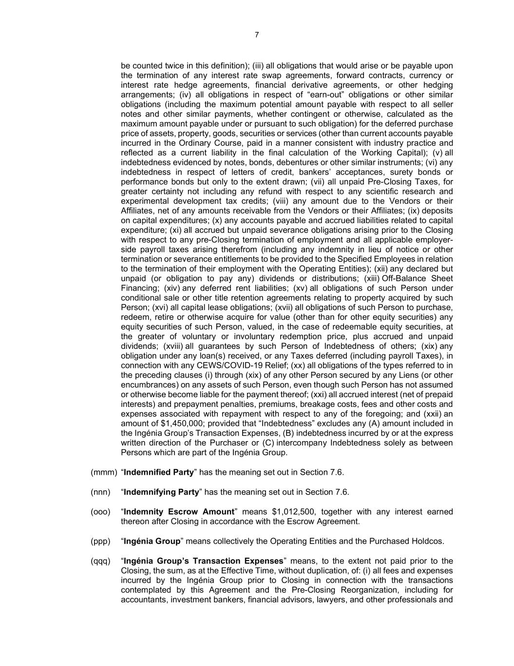 7 be counted twice in this definition); (iii) all obligations that would arise or be payable upon the termination of any interest rate swap agreements, forward contracts, currency or interest rate hedge agreements, financial derivative agreements, or other hedging arrangements; (iv) all obligations in respect of “earn-out” obligations or other similar obligations (including the maximum potential amount payable with respect to all seller notes and other similar payments, whether contingent or otherwise, calculated as the maximum amount payable under or pursuant to such obligation) for the deferred purchase price of assets, property, goods, securities or services (other than current accounts payable incurred in the Ordinary Course, paid in a manner consistent with industry practice and reflected as a current liability in the final calculation of the Working Capital); (v) all indebtedness evidenced by notes, bonds, debentures or other similar instruments; (vi) any indebtedness in respect of letters of credit, bankers’ acceptances, surety bonds or performance bonds but only to the extent drawn; (vii) all unpaid Pre-Closing Taxes, for greater certainty not including any refund with respect to any scientific research and experimental development tax credits; (viii) any amount due to the Vendors or their Affiliates, net of any amounts receivable from the Vendors or their Affiliates; (ix) deposits on capital expenditures; (x) any accounts payable and accrued liabilities related to capital expenditure; (xi) all accrued but unpaid severance obligations arising prior to the Closing with respect to any pre-Closing termination of employment and all applicable employer- side payroll taxes arising therefrom (including any indemnity in lieu of notice or other termination or severance entitlements to be provided to the Specified Employees in relation to the termination of their employment with the Operating Entities); (xii) any declared but unpaid (or obligation to pay any) dividends or distributions; (xiii) Off-Balance Sheet Financing; (xiv) any deferred rent liabilities; (xv) all obligations of such Person under conditional sale or other title retention agreements relating to property acquired by such Person; (xvi) all capital lease obligations; (xvii) all obligations of such Person to purchase, redeem, retire or otherwise acquire for value (other than for other equity securities) any equity securities of such Person, valued, in the case of redeemable equity securities, at the greater of voluntary or involuntary redemption price, plus accrued and unpaid dividends; (xviii) all guarantees by such Person of Indebtedness of others; (xix) any obligation under any loan(s) received, or any Taxes deferred (including payroll Taxes), in connection with any CEWS/COVID-19 Relief; (xx) all obligations of the types referred to in the preceding clauses (i) through (xix) of any other Person secured by any Liens (or other encumbrances) on any assets of such Person, even though such Person has not assumed or otherwise become liable for the payment thereof; (xxi) all accrued interest (net of prepaid interests) and prepayment penalties, premiums, breakage costs, fees and other costs and expenses associated with repayment with respect to any of the foregoing; and (xxii) an amount of $1,450,000; provided that “Indebtedness” excludes any (A) amount included in the Ingénia Group’s Transaction Expenses, (B) indebtedness incurred by or at the express written direction of the Purchaser or (C) intercompany Indebtedness solely as between Persons which are part of the Ingénia Group. (mmm) “Indemnified Party” has the meaning set out in Section 7.6. (nnn) “Indemnifying Party” has the meaning set out in Section 7.6. (ooo) “Indemnity Escrow Amount” means $1,012,500, together with any interest earned thereon after Closing in accordance with the Escrow Agreement. (ppp) “Ingénia Group” means collectively the Operating Entities and the Purchased Holdcos. (qqq) “Ingénia Group’s Transaction Expenses” means, to the extent not paid prior to the Closing, the sum, as at the Effective Time, without duplication, of: (i) all fees and expenses incurred by the Ingénia Group prior to Closing in connection with the transactions contemplated by this Agreement and the Pre-Closing Reorganization, including for accountants, investment bankers, financial advisors, lawyers, and other professionals and