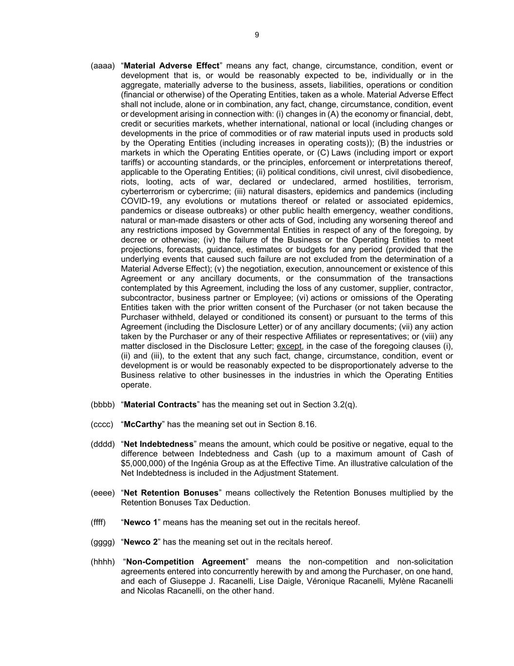 9 (aaaa) “Material Adverse Effect” means any fact, change, circumstance, condition, event or development that is, or would be reasonably expected to be, individually or in the aggregate, materially adverse to the business, assets, liabilities, operations or condition (financial or otherwise) of the Operating Entities, taken as a whole. Material Adverse Effect shall not include, alone or in combination, any fact, change, circumstance, condition, event or development arising in connection with: (i) changes in (A) the economy or financial, debt, credit or securities markets, whether international, national or local (including changes or developments in the price of commodities or of raw material inputs used in products sold by the Operating Entities (including increases in operating costs)); (B) the industries or markets in which the Operating Entities operate, or (C) Laws (including import or export tariffs) or accounting standards, or the principles, enforcement or interpretations thereof, applicable to the Operating Entities; (ii) political conditions, civil unrest, civil disobedience, riots, looting, acts of war, declared or undeclared, armed hostilities, terrorism, cyberterrorism or cybercrime; (iii) natural disasters, epidemics and pandemics (including COVID-19, any evolutions or mutations thereof or related or associated epidemics, pandemics or disease outbreaks) or other public health emergency, weather conditions, natural or man-made disasters or other acts of God, including any worsening thereof and any restrictions imposed by Governmental Entities in respect of any of the foregoing, by decree or otherwise; (iv) the failure of the Business or the Operating Entities to meet projections, forecasts, guidance, estimates or budgets for any period (provided that the underlying events that caused such failure are not excluded from the determination of a Material Adverse Effect); (v) the negotiation, execution, announcement or existence of this Agreement or any ancillary documents, or the consummation of the transactions contemplated by this Agreement, including the loss of any customer, supplier, contractor, subcontractor, business partner or Employee; (vi) actions or omissions of the Operating Entities taken with the prior written consent of the Purchaser (or not taken because the Purchaser withheld, delayed or conditioned its consent) or pursuant to the terms of this Agreement (including the Disclosure Letter) or of any ancillary documents; (vii) any action taken by the Purchaser or any of their respective Affiliates or representatives; or (viii) any matter disclosed in the Disclosure Letter; except, in the case of the foregoing clauses (i), (ii) and (iii), to the extent that any such fact, change, circumstance, condition, event or development is or would be reasonably expected to be disproportionately adverse to the Business relative to other businesses in the industries in which the Operating Entities operate. (bbbb) “Material Contracts” has the meaning set out in Section 3.2(q). (cccc) “McCarthy” has the meaning set out in Section 8.16. (dddd) “Net Indebtedness” means the amount, which could be positive or negative, equal to the difference between Indebtedness and Cash (up to a maximum amount of Cash of $5,000,000) of the Ingénia Group as at the Effective Time. An illustrative calculation of the Net Indebtedness is included in the Adjustment Statement. (eeee) “Net Retention Bonuses” means collectively the Retention Bonuses multiplied by the Retention Bonuses Tax Deduction. (ffff) “Newco 1” means has the meaning set out in the recitals hereof. (gggg) “Newco 2” has the meaning set out in the recitals hereof. (hhhh) “Non-Competition Agreement” means the non-competition and non-solicitation agreements entered into concurrently herewith by and among the Purchaser, on one hand, and each of Giuseppe J. Racanelli, Lise Daigle, Véronique Racanelli, Mylène Racanelli and Nicolas Racanelli, on the other hand.