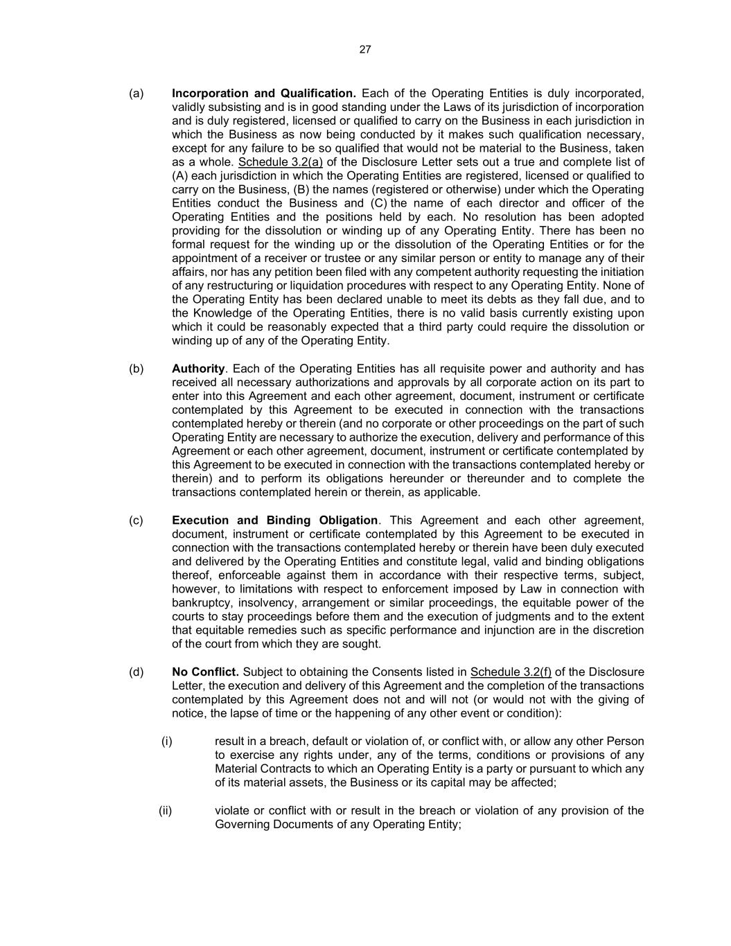 27 (a) Incorporation and Qualification. Each of the Operating Entities is duly incorporated, validly subsisting and is in good standing under the Laws of its jurisdiction of incorporation and is duly registered, licensed or qualified to carry on the Business in each jurisdiction in which the Business as now being conducted by it makes such qualification necessary, except for any failure to be so qualified that would not be material to the Business, taken as a whole. Schedule 3.2(a) of the Disclosure Letter sets out a true and complete list of (A) each jurisdiction in which the Operating Entities are registered, licensed or qualified to carry on the Business, (B) the names (registered or otherwise) under which the Operating Entities conduct the Business and (C) the name of each director and officer of the Operating Entities and the positions held by each. No resolution has been adopted providing for the dissolution or winding up of any Operating Entity. There has been no formal request for the winding up or the dissolution of the Operating Entities or for the appointment of a receiver or trustee or any similar person or entity to manage any of their affairs, nor has any petition been filed with any competent authority requesting the initiation of any restructuring or liquidation procedures with respect to any Operating Entity. None of the Operating Entity has been declared unable to meet its debts as they fall due, and to the Knowledge of the Operating Entities, there is no valid basis currently existing upon which it could be reasonably expected that a third party could require the dissolution or winding up of any of the Operating Entity. (b) Authority. Each of the Operating Entities has all requisite power and authority and has received all necessary authorizations and approvals by all corporate action on its part to enter into this Agreement and each other agreement, document, instrument or certificate contemplated by this Agreement to be executed in connection with the transactions contemplated hereby or therein (and no corporate or other proceedings on the part of such Operating Entity are necessary to authorize the execution, delivery and performance of this Agreement or each other agreement, document, instrument or certificate contemplated by this Agreement to be executed in connection with the transactions contemplated hereby or therein) and to perform its obligations hereunder or thereunder and to complete the transactions contemplated herein or therein, as applicable. (c) Execution and Binding Obligation. This Agreement and each other agreement, document, instrument or certificate contemplated by this Agreement to be executed in connection with the transactions contemplated hereby or therein have been duly executed and delivered by the Operating Entities and constitute legal, valid and binding obligations thereof, enforceable against them in accordance with their respective terms, subject, however, to limitations with respect to enforcement imposed by Law in connection with bankruptcy, insolvency, arrangement or similar proceedings, the equitable power of the courts to stay proceedings before them and the execution of judgments and to the extent that equitable remedies such as specific performance and injunction are in the discretion of the court from which they are sought. (d) No Conflict. Subject to obtaining the Consents listed in Schedule 3.2(f) of the Disclosure Letter, the execution and delivery of this Agreement and the completion of the transactions contemplated by this Agreement does not and will not (or would not with the giving of notice, the lapse of time or the happening of any other event or condition): (i) result in a breach, default or violation of, or conflict with, or allow any other Person to exercise any rights under, any of the terms, conditions or provisions of any Material Contracts to which an Operating Entity is a party or pursuant to which any of its material assets, the Business or its capital may be affected; (ii) violate or conflict with or result in the breach or violation of any provision of the Governing Documents of any Operating Entity;
