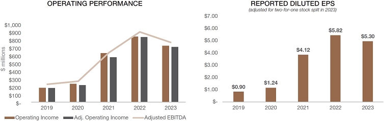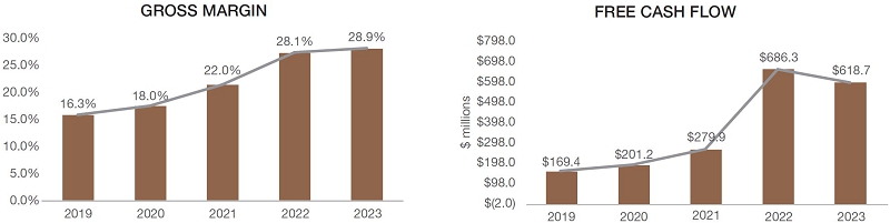 In terms of financial performance, 2023 was the second best year in the history of our Company, surpassed only by the record year we had in 2022. Net income was approximately $602.9 million on $3.4 billion in sales; we generated an impressive $672.8 million in cash flow from operations; and we delivered a 61.9% return to our shareholders.