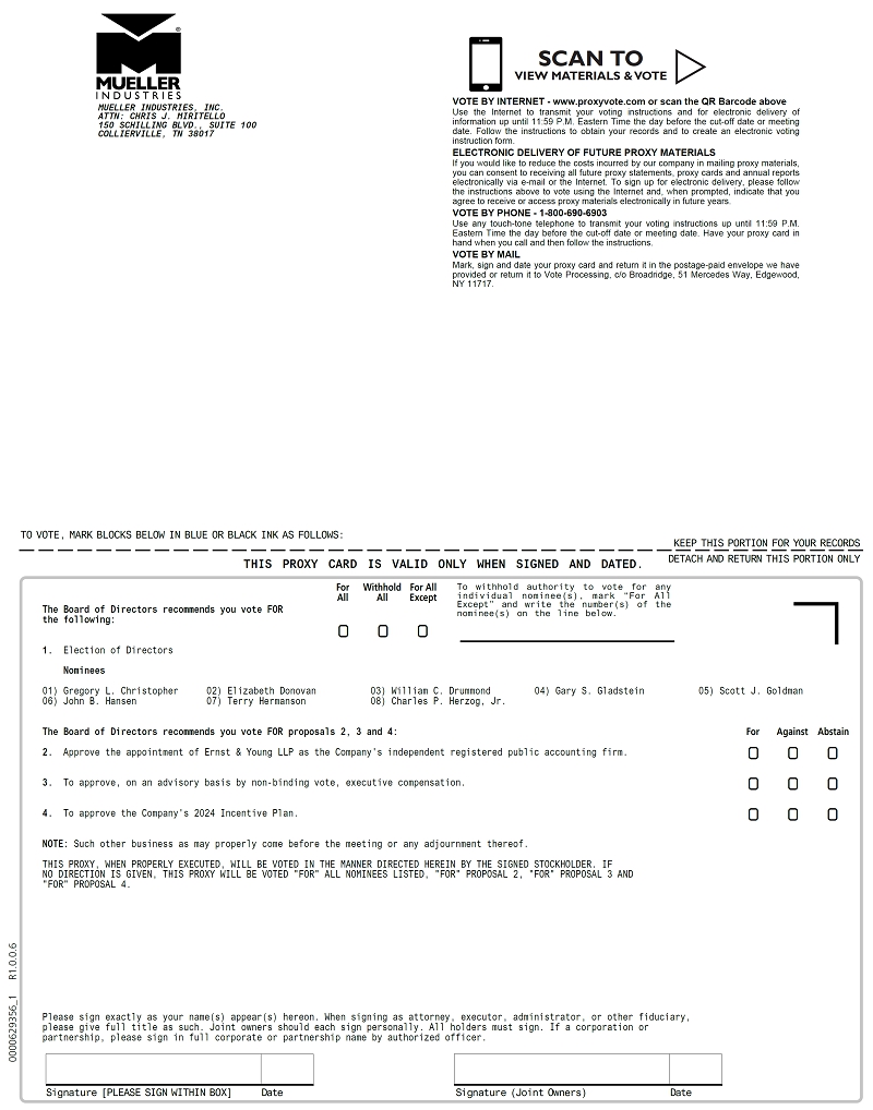 We are providing you with these proxy materials in connection with the solicitation by the Board of Directors of Mueller Industries, Inc. (the “Company”) of proxies for our 2024 Annual Meeting of Stockholders (the “Annual Meeting”), which will be held at 8:00 A.M. Central time on Thursday, May 9, 2024, at our corporate headquarters located at 150 Schilling Boulevard, Collierville, Tennessee 38017.