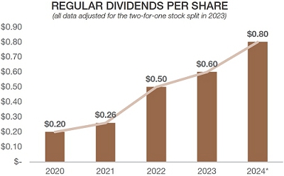 The Company declared and paid a quarterly cash dividend of 30 cents per common share in each of the first, second and third quarters of 2023. A proportionally adjusted dividend of 15 cents per common share was paid in the fourth quarter following the two-for-one stock split that took effect on October 20, 2023. Payment of dividends in the future is dependent upon our financial condition, cash flows, capital requirements, and other factors.