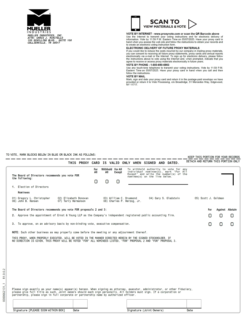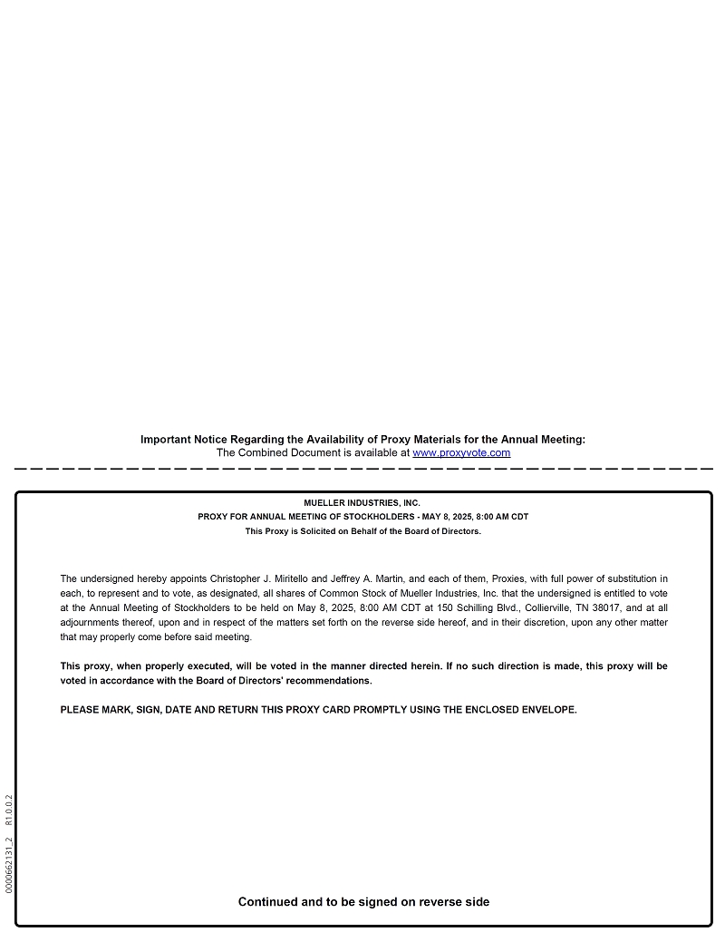 Important Notice Regarding the Availability of Proxy Materials for the Annual Meeting: The Combined Document is available at www.proxyvote.com MUELLER INDUSTRIES, INC. PROXY FOR ANNUAL MEETING OF STOCKHOLDERS - MAY 8, 2025, 8:00 AM CDT This Proxy is Solicited on Behalf of the Board of Directors. The undersigned hereby appoints Christopher J. Miritello and Jeffrey A. Martin, and each of them, Proxies, with full power of substitution in each, to represent and to vote, as designated, all shares of Common Stock of Mueller Industries, Inc. that the undersigned is entitled to vote at the Annual Meeting of Stockholders to be held on May 8, 2025, 8:00 AM CDT at 150 Schilling Blvd., Collierville, TN 38017, and at all adjournments thereof, upon and in respect of the matters set forth on the reverse side hereof, and in their discretion, upon any other matter that may properly come before said meeting. This proxy, when properly executed, will be voted in the manner directed herein. If no such direction is made, this proxy will be voted in accordance with the Board of Directors’ recommendations. PLEASE MARK, SIGN, DATE AND RETURN THIS PROXY CARD PROMPTLY USING THE ENCLOSED ENVELOPE. Continued and to be signed on reverse side 0000662131_2 R1.0.0.2