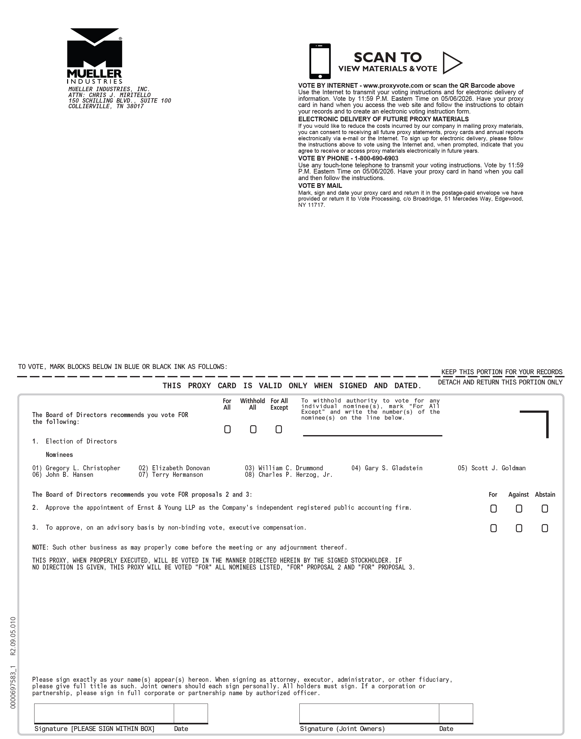 A COPY OF THE COMPANY’S ANNUAL REPORT ON FORM 10-K AS FILED FOR THE YEAR ENDED DECEMBER 27, 2025 (EXCLUDING EXHIBITS) OR, AS NOTED HEREIN, ANY OF THE COMPANY’S BOARD COMMITTEE CHARTERS, CORPORATE GOVERNANCE GUIDELINES, OR CODE OF ETHICS WILL BE FURNISHED, WITHOUT CHARGE, BY WRITING TO CHRISTOPHER J. MIRITELLO, CORPORATE SECRETARY, MUELLER INDUSTRIES, INC., AT THE COMPANY’S PRINCIPAL PLACE OF BUSINESS (150 SCHILLING BOULEVARD, SUITE 100, COLLIERVILLE, TENNESSEE 38017). UPON RECEIPT BY WRITING TO THE FOREGOING ADDRESS, THE COMPANY WILL ALSO FURNISH ANY OTHER EXHIBIT OF THE ANNUAL REPORT ON FORM 10-K UPON ADVANCE PAYMENT OF THE REASONABLE OUT-OF-POCKET EXPENSES OF THE COMPANY RELATED TO THE COMPANY’S FURNISHING OF SUCH EXHIBIT.
