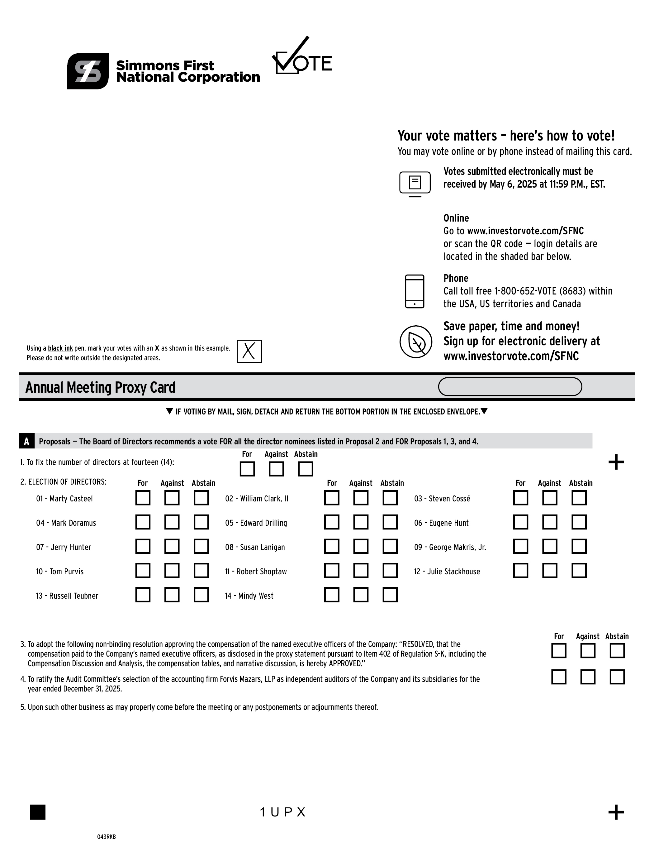 Simmons First National Corporation Your vote matters – here’s how to vote You may vote online or by phone instead of mailing this card. Votes submitted electronically must be received by May 6, 2025 at 11:59 P.M., EST. Online Go to www.investorvote.com/SFNC or scan the QR code — login details are located in the shaded bar below. Phone Call toll free 1-800-652-VOTE (8683) within the USA, US territories and Canada Save paper, time and money! Sign up for electronic delivery at www.investorvote.com/SFNC Using a black ink pen, mark your votes with an X as shown in this example. Please do not write outside the designated areas. Annual Meeting Proxy Card IF VOTING BY MAIL, SIGN, DETACH AND RETURN THE BOTTOM PORTION IN THE ENCLOSED ENVELOPE. Proposals — The Board of Directors recommends a vote FOR all the director nominees listed A in Proposal 2 and FOR Proposals 1, 3, and 4. 1. To fix the number of directors at fourteen (14): 2. ELECTION OF DIRECTORS: 01 - Marty Casteel 04 - Mark Doramus 07 - Jerry Hunter 10 - Tom Purvis 13 - Russell Teubner For Against Abstain 02 - William Clark, II 05 - Edward Drilling 08 - Susan Lanigan 11 - Robert Shoptaw 14 - Mindy West 03 - Steven Cossé 06 - Eugene Hunt 09 - George Makris, Jr. 12 - Julie Stackhouse 3. To adopt the following non-binding resolution approving the compensation of the named executive officers of the Company: “RESOLVED, that the compensation paid to the Company’s named executive officers, as disclosed in the proxy statement pursuant to Item 402 of Regulation S-K, including the Compensation Discussion and Analysis, the compensation tables, and narrative discussion, is hereby APPROVED.” 4. To ratify the Audit Committee’s selection of the accounting firm Forvis Mazars, LLP as independent auditors of the Company and its subsidiaries for the year ended December 31, 2025. 5. Upon such other business as may properly come before the meeting or any postponements or adjournments thereof. 1 U P X 043RKB