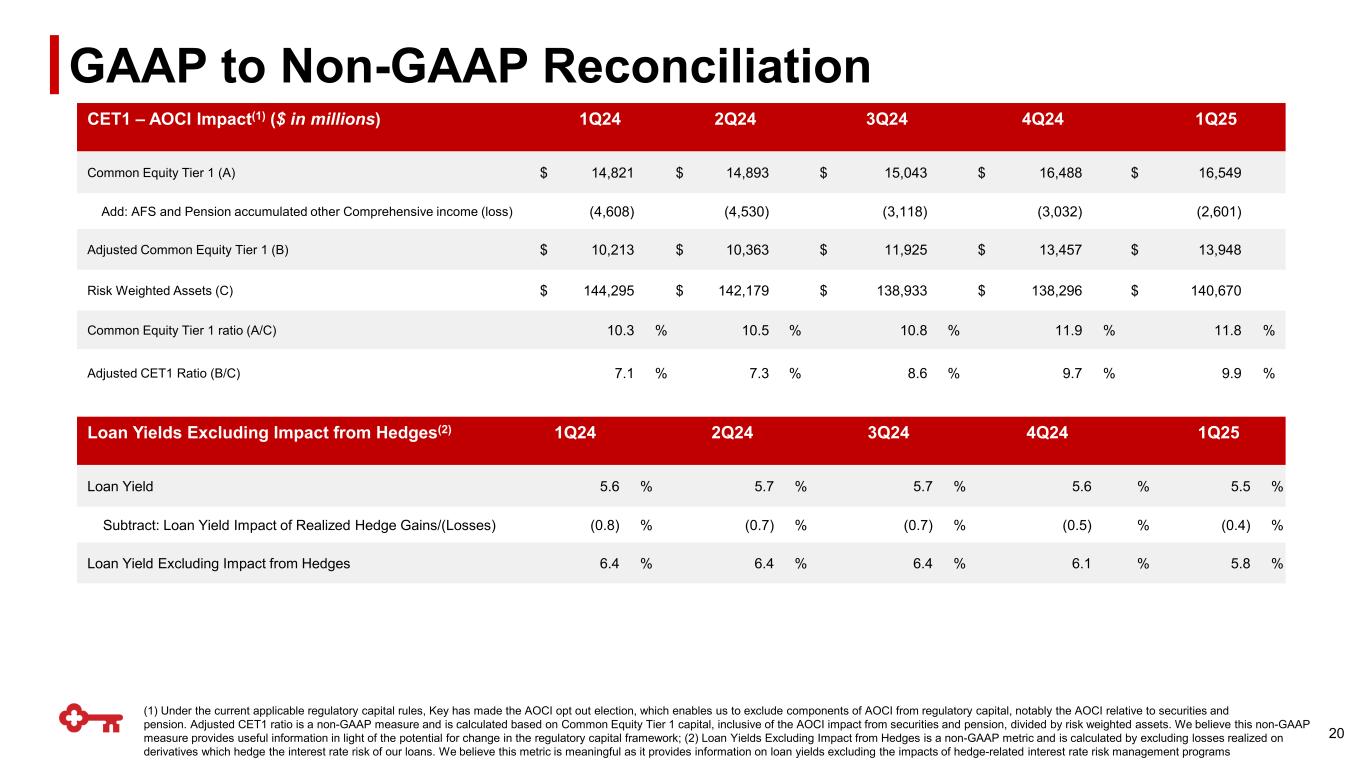 GAAP to Non-GAAP Reconciliation 17 $ in millions 1Q25 4Q24 1Q24 Tangible common equity to tangible assets at period end Key shareholders’ equity (GAAP) $ 19,003 $ 18,176 $ 14,574 Less: Intangible assets 2,774 2,779 2,799 Preferred stock(1) 2,446 2,446 2,446 Tangible common equity (non-GAAP) $ 13,783 $ 12,951 $ 9,302 Total assets (GAAP) $ 188,691 $ 187,168 $ 187,485 Less: Intangible assets 2,774 2,779 2,799 Tangible assets (non-GAAP) $ 185,917 $ 184,389 $ 184,686 Tangible common equity to tangible assets ratio (non-GAAP) 7.41 % 7.02 % 5.04 % Average tangible common equity Average Key shareholders’ equity (GAAP) $ 18,632 $ 16,732 $ 14,649 Less: Intangible assets (average) 2,777 2,783 2,802 Preferred stock (average) 2,500 2,500 2,500 Average tangible common equity (non-GAAP) $ 13,355 $ 11,449 $ 9,347 Return on average tangible common equity consolidated Net income (loss) attributable to Key common shareholders (GAAP) $ 370 $ (279) $ 183 Average tangible common equity (non-GAAP) 13,355 11,449 9,347 Return on average tangible common equity consolidation (non-GAAP) 11.24 % (9.69) % 7.87 % Return on average tangible common equity from continuing operations Net income (loss) from continuing operations attributable to Key common shareholders (GAAP) $ 369 $ (279) $ 183 Average tangible common equity (non-GAAP) 13,355 11,449 9,347 Return on average tangible common equity from continuing operations (non-GAAP) 11.21 % (9.69) % 7.87 % (1) Net of capital surplus