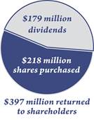 Returned record amounts of cash to shareholders in 2021, including $179 million in dividends and $218 million in share repurchases.