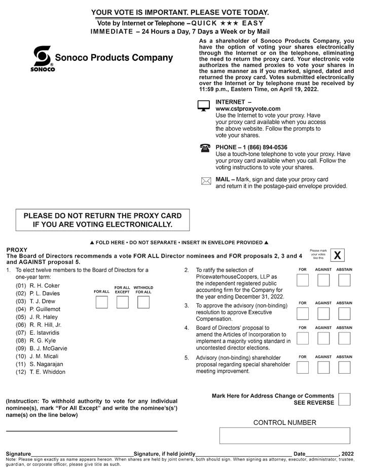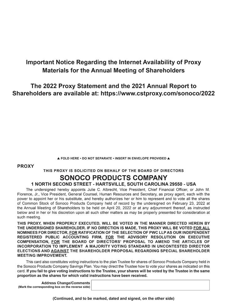 The enclosed proxy materials are being mailed on or about March 18, 2022, in connection with the solicitation by the Board of Directors of Sonoco Products Company of proxies to be used at the Annual Meeting of Shareholders. We have enclosed a copy of the 2021 Annual Report or we have delivered a single copy of the Annual Report for all shareholders at your address. The Annual Report is not part of the proxy soliciting material.