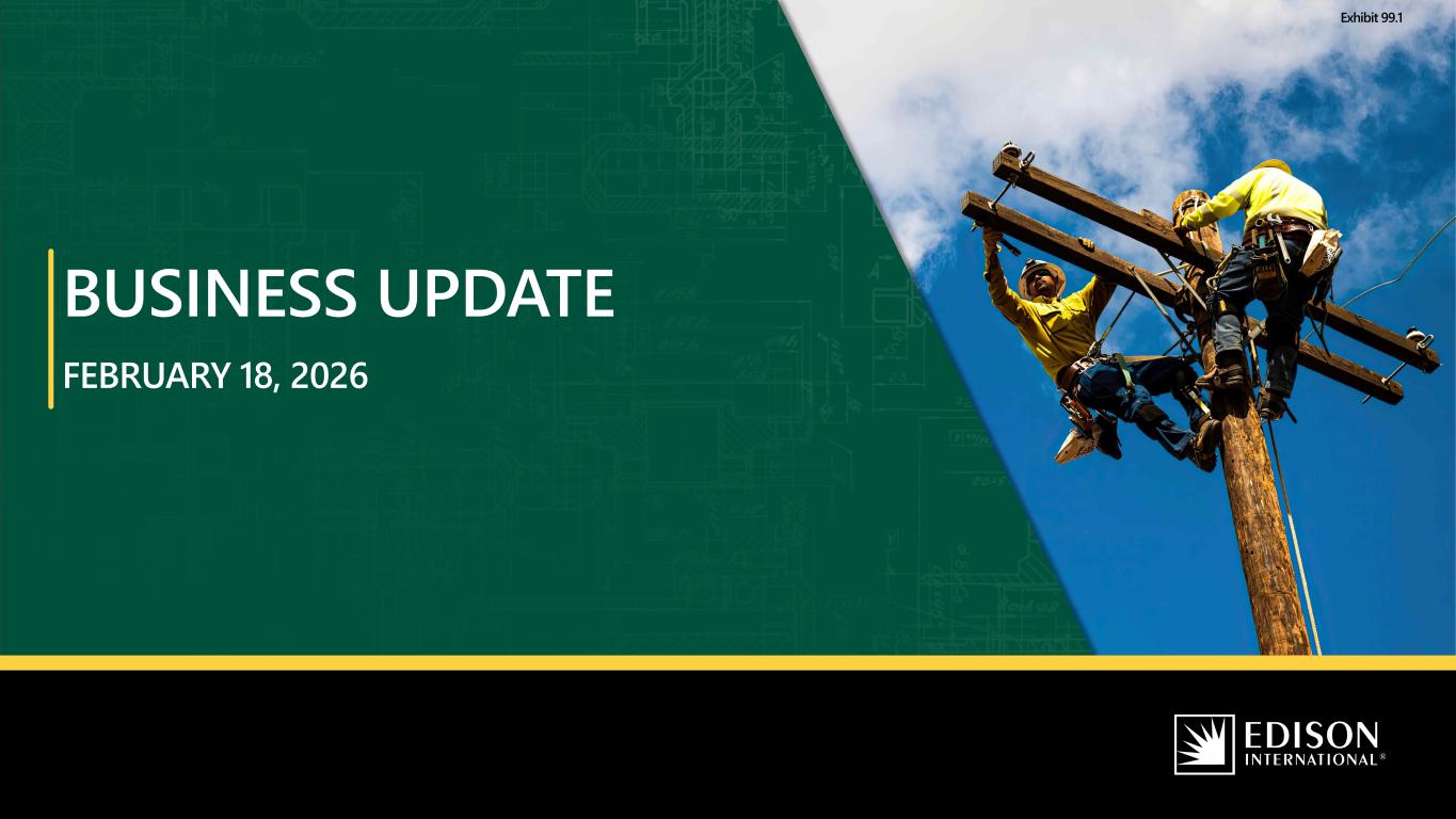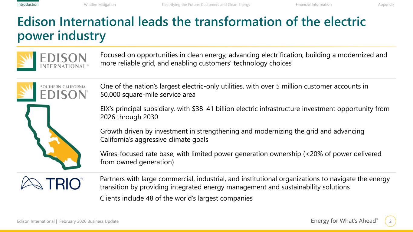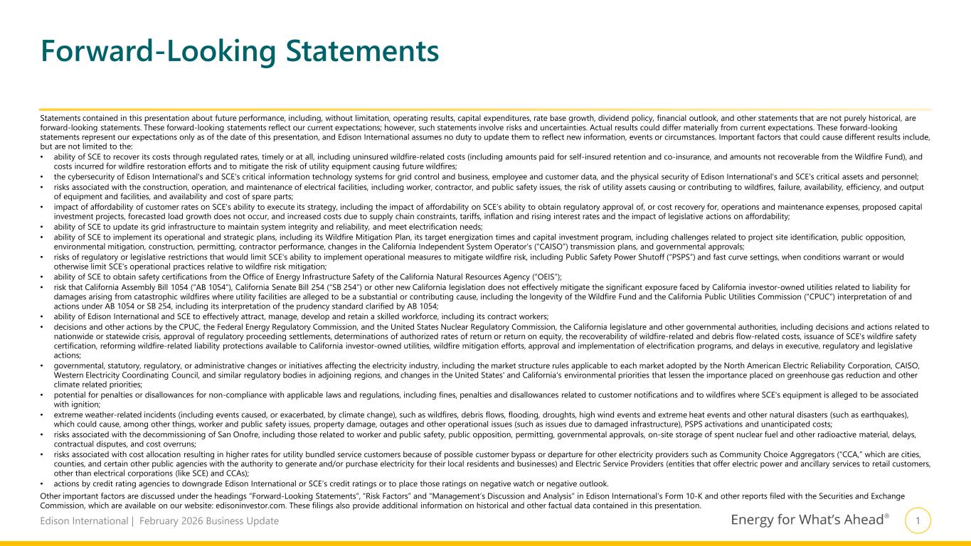 1Edison International | February 2026 Business Update Statements contained in this presentation about future performance, including, without limitation, operating results, capital expenditures, rate base growth, dividend policy, financial outlook, and other statements that are not purely historical, are forward-looking statements. These forward-looking statements reflect our current expectations; however, such statements involve risks and uncertainties. Actual results could differ materially from current expectations. These forward-looking statements represent our expectations only as of the date of this presentation, and Edison International assumes no duty to update them to reflect new information, events or circumstances. Important factors that could cause different results include, but are not limited to the: • ability of SCE to recover its costs through regulated rates, timely or at all, including uninsured wildfire-related costs (including amounts paid for self-insured retention and co-insurance, and amounts not recoverable from the Wildfire Fund), and costs incurred for wildfire restoration efforts and to mitigate the risk of utility equipment causing future wildfires; • the cybersecurity of Edison International's and SCE's critical information technology systems for grid control and business, employee and customer data, and the physical security of Edison International's and SCE's critical assets and personnel; • risks associated with the construction, operation, and maintenance of electrical facilities, including worker, contractor, and public safety issues, the risk of utility assets causing or contributing to wildfires, failure, availability, efficiency, and output of equipment and facilities, and availability and cost of spare parts; • impact of affordability of customer rates on SCE's ability to execute its strategy, including the impact of affordability on SCE’s ability to obtain regulatory approval of, or cost recovery for, operations and maintenance expenses, proposed capital investment projects, forecasted load growth does not occur, and increased costs due to supply chain constraints, tariffs, inflation and rising interest rates and the impact of legislative actions on affordability; • ability of SCE to update its grid infrastructure to maintain system integrity and reliability, and meet electrification needs; • ability of SCE to implement its operational and strategic plans, including its Wildfire Mitigation Plan, its target energization times and capital investment program, including challenges related to project site identification, public opposition, environmental mitigation, construction, permitting, contractor performance, changes in the California Independent System Operator's (“CAISO”) transmission plans, and governmental approvals; • risks of regulatory or legislative restrictions that would limit SCE's ability to implement operational measures to mitigate wildfire risk, including Public Safety Power Shutoff (“PSPS”) and fast curve settings, when conditions warrant or would otherwise limit SCE's operational practices relative to wildfire risk mitigation; • ability of SCE to obtain safety certifications from the Office of Energy Infrastructure Safety of the California Natural Resources Agency (“OEIS“); • risk that California Assembly Bill 1054 (“AB 1054“), California Senate Bill 254 (“SB 254”) or other new California legislation does not effectively mitigate the significant exposure faced by California investor-owned utilities related to liability for damages arising from catastrophic wildfires where utility facilities are alleged to be a substantial or contributing cause, including the longevity of the Wildfire Fund and the California Public Utilities Commission (“CPUC”) interpretation of and actions under AB 1054 or SB 254, including its interpretation of the prudency standard clarified by AB 1054; • ability of Edison International and SCE to effectively attract, manage, develop and retain a skilled workforce, including its contract workers; • decisions and other actions by the CPUC, the Federal Energy Regulatory Commission, and the United States Nuclear Regulatory Commission, the California legislature and other governmental authorities, including decisions and actions related to nationwide or statewide crisis, approval of regulatory proceeding settlements, determinations of authorized rates of return or return on equity, the recoverability of wildfire-related and debris flow-related costs, issuance of SCE's wildfire safety certification, reforming wildfire-related liability protections available to California investor-owned utilities, wildfire mitigation efforts, approval and implementation of electrification programs, and delays in executive, regulatory and legislative actions; • governmental, statutory, regulatory, or administrative changes or initiatives affecting the electricity industry, including the market structure rules applicable to each market adopted by the North American Electric Reliability Corporation, CAISO, Western Electricity Coordinating Council, and similar regulatory bodies in adjoining regions, and changes in the United States' and California's environmental priorities that lessen the importance placed on greenhouse gas reduction and other climate related priorities; • potential for penalties or disallowances for non-compliance with applicable laws and regulations, including fines, penalties and disallowances related to customer notifications and to wildfires where SCE's equipment is alleged to be associated with ignition; • extreme weather-related incidents (including events caused, or exacerbated, by climate change), such as wildfires, debris flows, flooding, droughts, high wind events and extreme heat events and other natural disasters (such as earthquakes), which could cause, among other things, worker and public safety issues, property damage, outages and other operational issue
