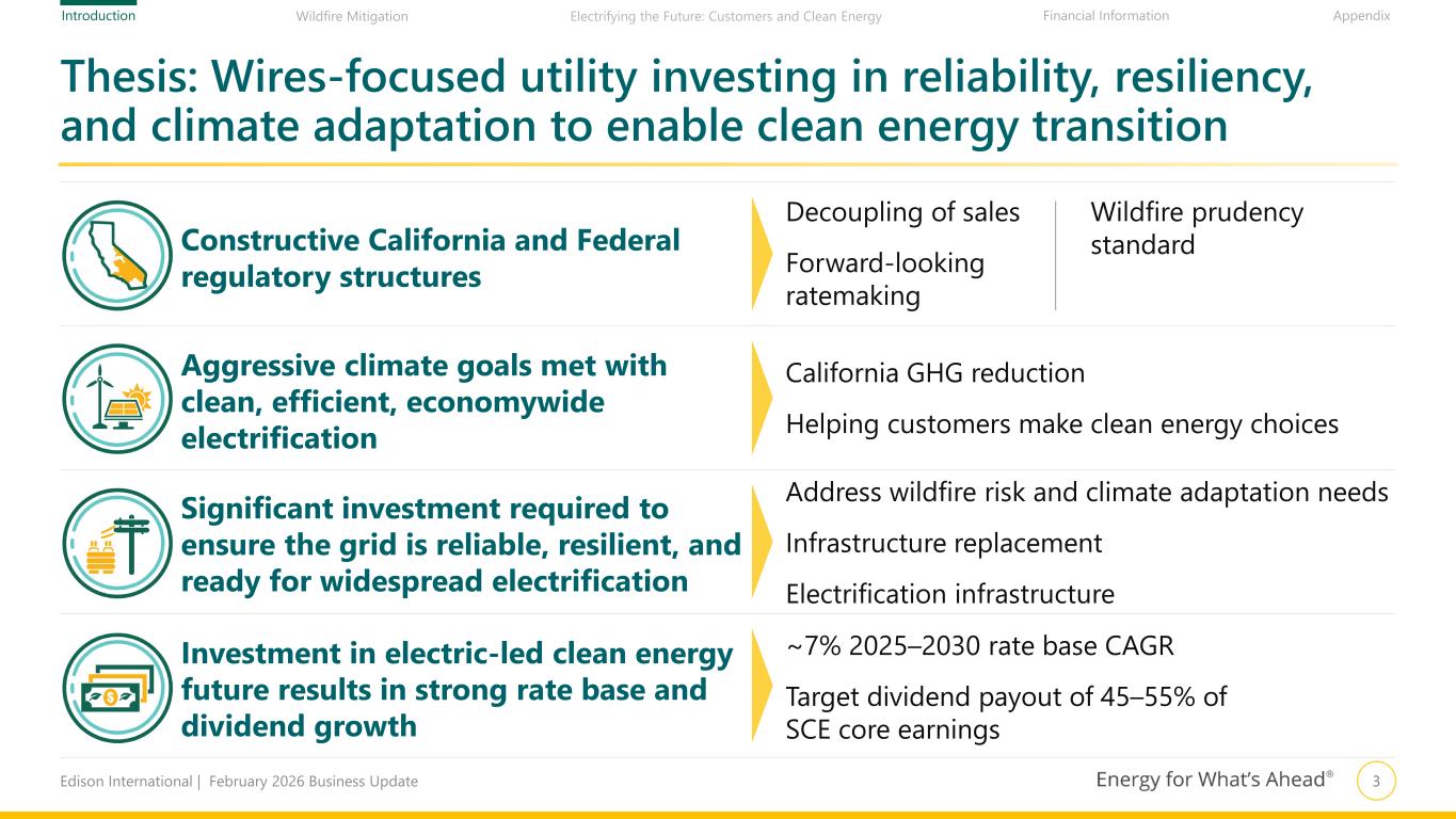 2Edison International | February 2026 Business Update Wildfire Mitigation Financial Information AppendixIntroduction Electrifying the Future: Customers and Clean Energy Edison International leads the transformation of the electric power industry One of the nation’s largest electric-only utilities, with over 5 million customer accounts in 50,000 square-mile service area EIX’s principal subsidiary, with $38–41 billion electric infrastructure investment opportunity from 2026 through 2030 Growth driven by investment in strengthening and modernizing the grid and advancing California’s aggressive climate goals Wires-focused rate base, with limited power generation ownership (<20% of power delivered from owned generation) Partners with large commercial, industrial, and institutional organizations to navigate the energy transition by providing integrated energy management and sustainability solutions Clients include 48 of the world’s largest companies Focused on opportunities in clean energy, advancing electrification, building a modernized and more reliable grid, and enabling customers’ technology choices