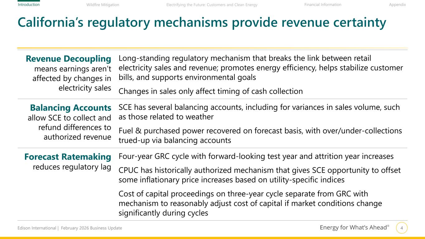 3Edison International | February 2026 Business Update Wildfire Mitigation Financial Information AppendixIntroduction Electrifying the Future: Customers and Clean Energy Thesis: Wires-focused utility investing in reliability, resiliency, and climate adaptation to enable clean energy transition Constructive California and Federal regulatory structures Aggressive climate goals met with clean, efficient, economywide electrification Significant investment required to ensure the grid is reliable, resilient, and ready for widespread electrification Investment in electric-led clean energy future results in strong rate base and dividend growth Decoupling of sales Forward-looking ratemaking Wildfire prudency standard California GHG reduction Helping customers make clean energy choices Address wildfire risk and climate adaptation needs Infrastructure replacement Electrification infrastructure ~7% 2025–2030 rate base CAGR Target dividend payout of 45–55% of SCE core earnings