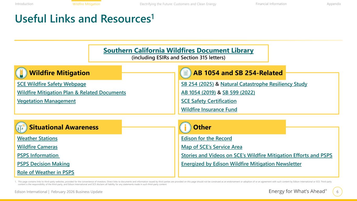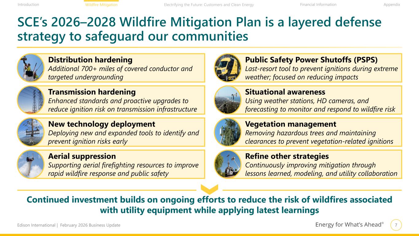 6Edison International | February 2026 Business Update Financial Information AppendixIntroduction Wildfire Mitigation Electrifying the Future: Customers and Clean Energy SB 254 (2025) & Natural Catastrophe Resiliency Study AB 1054 (2019) & SB 599 (2022) SCE Safety Certification Wildfire Insurance Fund AB 1054 and SB 254-Related Edison for the Record Map of SCE’s Service Area Stories and Videos on SCE’s Wildfire Mitigation Efforts and PSPS Energized by Edison Wildfire Mitigation Newsletter Other Useful Links and Resources1 Weather Stations Wildfire Cameras PSPS Information PSPS Decision Making Role of Weather in PSPS SCE Wildfire Safety Webpage Wildfire Mitigation Plan & Related Documents Vegetation Management Southern California Wildfires Document Library (including ESIRs and Section 315 letters) Situational Awareness Wildfire Mitigation 1. This page contains links to third-party websites, provided for the convenience of investors. Direct links to documents and information issued by third parties are provided on this page should not be construed as an endorsement or adoption of or an agreement with such content by Edison International or SCE. Third-party content is the responsibility of the third-party, and Edison International and SCE disclaim all liability for any statements made in such third-party content