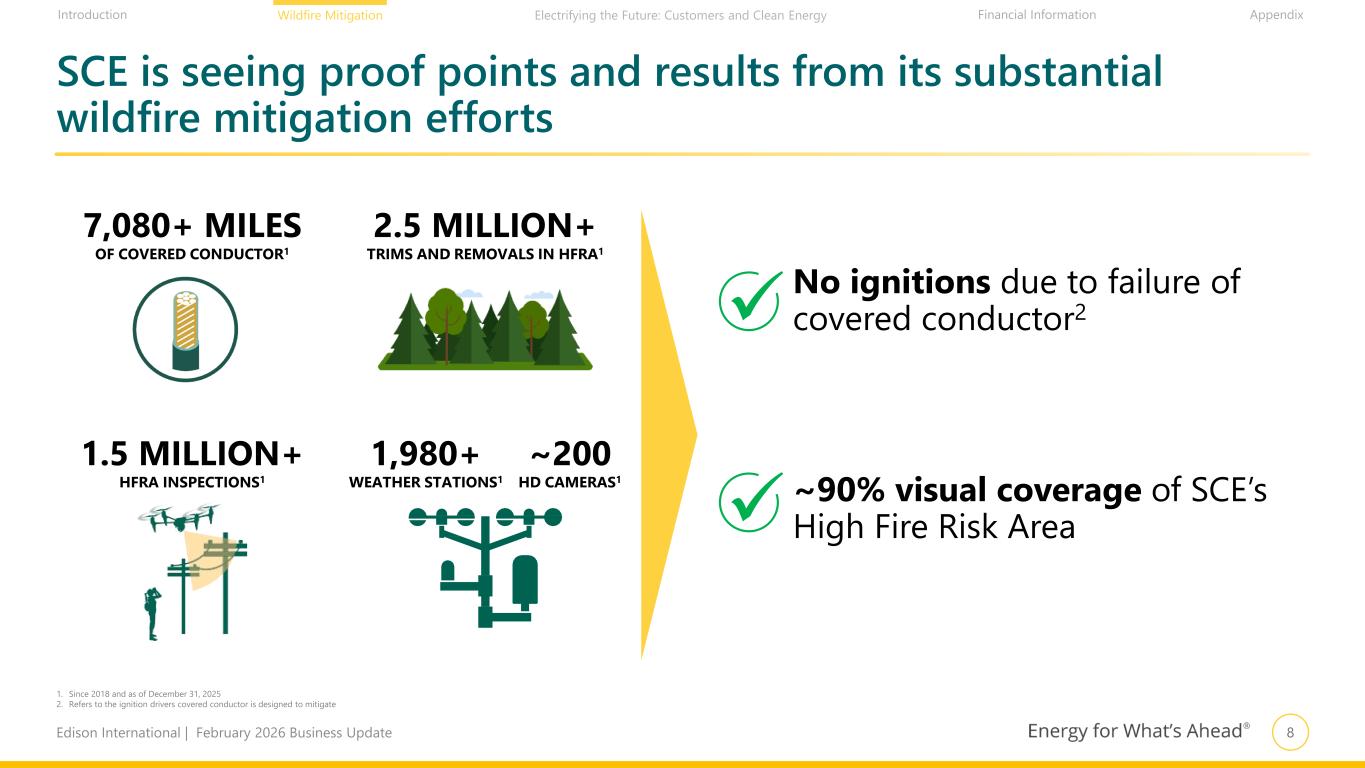 7Edison International | February 2026 Business Update Financial Information AppendixIntroduction Wildfire Mitigation Electrifying the Future: Customers and Clean Energy SCE’s 2026–2028 Wildfire Mitigation Plan is a layered defense strategy to safeguard our communities Distribution hardening Additional 700+ miles of covered conductor and targeted undergrounding Transmission hardening Enhanced standards and proactive upgrades to reduce ignition risk on transmission infrastructure New technology deployment Deploying new and expanded tools to identify and prevent ignition risks early Public Safety Power Shutoffs (PSPS) Last-resort tool to prevent ignitions during extreme weather; focused on reducing impacts Situational awareness Using weather stations, HD cameras, and forecasting to monitor and respond to wildfire risk Continued investment builds on ongoing efforts to reduce the risk of wildfires associated with utility equipment while applying latest learnings Vegetation management Removing hazardous trees and maintaining clearances to prevent vegetation-related ignitions Aerial suppression Supporting aerial firefighting resources to improve rapid wildfire response and public safety Refine other strategies Continuously improving mitigation through lessons learned, modeling, and utility collaboration