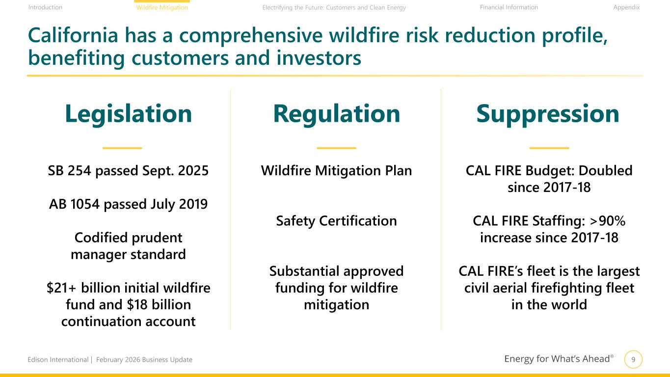 8Edison International | February 2026 Business Update Financial Information AppendixIntroduction Wildfire Mitigation Electrifying the Future: Customers and Clean Energy SCE is seeing proof points and results from its substantial wildfire mitigation efforts 1. Since 2018 and as of December 31, 2025 2. Refers to the ignition drivers covered conductor is designed to mitigate 7,080+ MILES OF COVERED CONDUCTOR1 2.5 MILLION+ TRIMS AND REMOVALS IN HFRA1 1.5 MILLION+ HFRA INSPECTIONS1 1,980+ WEATHER STATIONS1 ~200 HD CAMERAS1 No ignitions due to failure of covered conductor2 ~90% visual coverage of SCE’s High Fire Risk Area