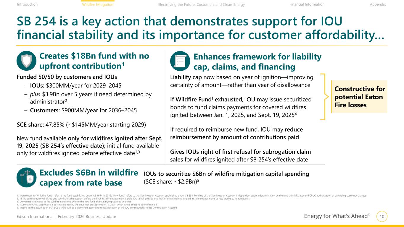 9Edison International | February 2026 Business Update Financial Information AppendixIntroduction Wildfire Mitigation Electrifying the Future: Customers and Clean Energy California has a comprehensive wildfire risk reduction profile, benefiting customers and investors Suppression CAL FIRE Budget: Doubled since 2017-18 CAL FIRE Staffing: >90% increase since 2017-18 CAL FIRE’s fleet is the largest civil aerial firefighting fleet in the world Legislation SB 254 passed Sept. 2025 AB 1054 passed July 2019 Codified prudent manager standard $21+ billion initial wildfire fund and $18 billion continuation account Regulation Wildfire Mitigation Plan Safety Certification Substantial approved funding for wildfire mitigation