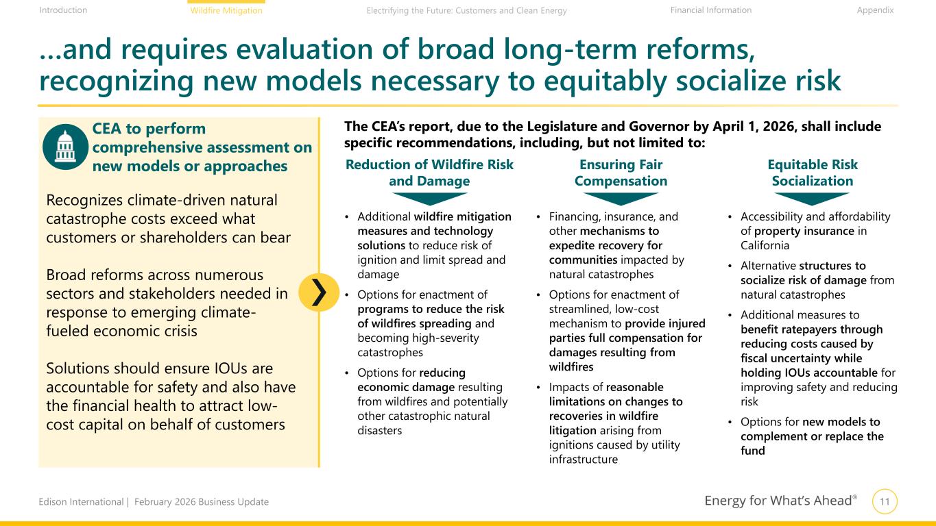10Edison International | February 2026 Business Update Financial Information AppendixIntroduction Wildfire Mitigation Electrifying the Future: Customers and Clean Energy SB 254 is a key action that demonstrates support for IOU financial stability and its importance for customer affordability… 1. References to “Wildfire Fund” refer to the fund established under AB 1054 in 2019; “New fund” refers to the Continuation Account established under SB 254. Funding of the Continuation Account is dependent upon a determination by the fund administrator and CPUC authorization of extending customer charges 2. If the administrator winds up and terminates the account before the final installment payment is paid, IOUs shall provide one-half of the remaining unpaid installment payments as rate credits to its ratepayers 3. Any remaining value in the Wildfire Fund rolls over to the new fund after satisfying covered wildfires 4. Subject to CPUC approval; SB 254 was signed by the governor on September 19, 2025, which is the effective date of the bill 5. Based on the assumption that SCE’s share will be determined according to its allocation of the IOU contributions to the Continuation Account Excludes $6Bn in wildfire capex from rate base Creates $18Bn fund with no upfront contribution1 Funded 50/50 by customers and IOUs – IOUs: $300MM/year for 2029–2045 – plus $3.9Bn over 5 years if need determined by administrator2 – Customers: $900MM/year for 2036–2045 SCE share: 47.85% (~$145MM/year starting 2029) New fund available only for wildfires ignited after Sept. 19, 2025 (SB 254’s effective date); initial fund available only for wildfires ignited before effective date1,3 Enhances framework for liability cap, claims, and financing Liability cap now based on year of ignition—improving certainty of amount—rather than year of disallowance If Wildfire Fund1 exhausted, IOU may issue securitized bonds to fund claims payments for covered wildfires ignited between Jan. 1, 2025, and Sept. 19, 20254 If required to reimburse new fund, IOU may reduce reimbursement by amount of contributions paid Gives IOUs right of first refusal for subrogation claim sales for wildfires ignited after SB 254’s effective date IOUs to securitize $6Bn of wildfire mitigation capital spending (SCE share: ~$2.9Bn)5 Constructive for potential Eaton Fire losses