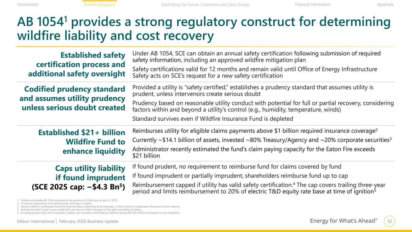 11Edison International | February 2026 Business Update Financial Information AppendixIntroduction Wildfire Mitigation Electrifying the Future: Customers and Clean Energy …and requires evaluation of broad long-term reforms, recognizing new models necessary to equitably socialize risk Recognizes climate-driven natural catastrophe costs exceed what customers or shareholders can bear Broad reforms across numerous sectors and stakeholders needed in response to emerging climate- fueled economic crisis Solutions should ensure IOUs are accountable for safety and also have the financial health to attract low- cost capital on behalf of customers CEA to perform comprehensive assessment on new models or approaches The CEA’s report, due to the Legislature and Governor by April 1, 2026, shall include specific recommendations, including, but not limited to: Reduction of Wildfire Risk and Damage Ensuring Fair Compensation Equitable Risk Socialization • Additional wildfire mitigation measures and technology solutions to reduce risk of ignition and limit spread and damage • Options for enactment of programs to reduce the risk of wildfires spreading and becoming high-severity catastrophes • Options for reducing economic damage resulting from wildfires and potentially other catastrophic natural disasters • Financing, insurance, and other mechanisms to expedite recovery for communities impacted by natural catastrophes • Options for enactment of streamlined, low-cost mechanism to provide injured parties full compensation for damages resulting from wildfires • Impacts of reasonable limitations on changes to recoveries in wildfire litigation arising from ignitions caused by utility infrastructure • Accessibility and affordability of property insurance in California • Alternative structures to socialize risk of damage from natural catastrophes • Additional measures to benefit ratepayers through reducing costs caused by fiscal uncertainty while holding IOUs accountable for improving safety and reducing risk • Options for new models to complement or replace the fund
