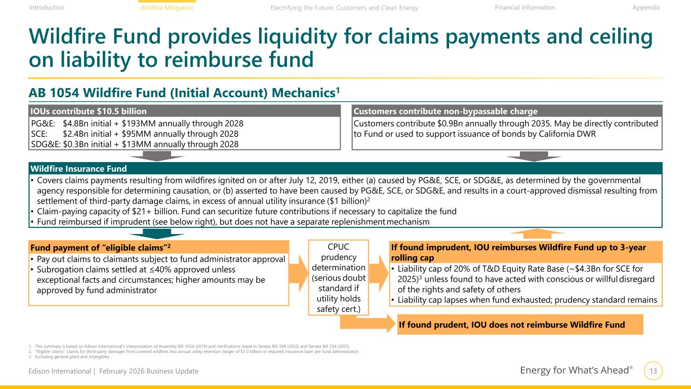 12Edison International | February 2026 Business Update Financial Information AppendixIntroduction Wildfire Mitigation Electrifying the Future: Customers and Clean Energy AB 10541 provides a strong regulatory construct for determining wildfire liability and cost recovery Established safety certification process and additional safety oversight Under AB 1054, SCE can obtain an annual safety certification following submission of required safety information, including an approved wildfire mitigation plan Safety certifications valid for 12 months and remain valid until Office of Energy Infrastructure Safety acts on SCE’s request for a new safety certification Codified prudency standard and assumes utility prudency unless serious doubt created Provided a utility is “safety certified,” establishes a prudency standard that assumes utility is prudent, unless intervenors create serious doubt Prudency based on reasonable utility conduct with potential for full or partial recovery, considering factors within and beyond a utility’s control (e.g., humidity, temperature, winds) Standard survives even if Wildfire Insurance Fund is depleted Established $21+ billion Wildfire Fund to enhance liquidity Reimburses utility for eligible claims payments above $1 billion required insurance coverage2 Currently ~$14.1 billion of assets, invested ~80% Treasury/Agency and ~20% corporate securities3 Administrator recently estimated the fund's claim paying capacity for the Eaton Fire exceeds $21 billion Caps utility liability if found imprudent (SCE 2025 cap: ~$4.3 Bn5) If found prudent, no requirement to reimburse fund for claims covered by fund If found imprudent or partially imprudent, shareholders reimburse fund up to cap Reimbursement capped if utility has valid safety certification.4 The cap covers trailing three-year period and limits reimbursement to 20% of electric T&D equity rate base at time of ignition5 1. California Assembly Bill 1054, executed by the governor of California on July 12, 2019 2. Or amount required by fund administrator, whichever is higher 3. Source: California Earthquake Authority Financial Report presented at the February 5, 2026 California Catastrophe Response Council meeting 4. And has not been found to have acted with conscious or willful disregard of the rights and safety of others 5. Excluding general plant and intangibles. Liability cap calculation amended by California Senate Bill 254 (2025) to be based on year of ignition