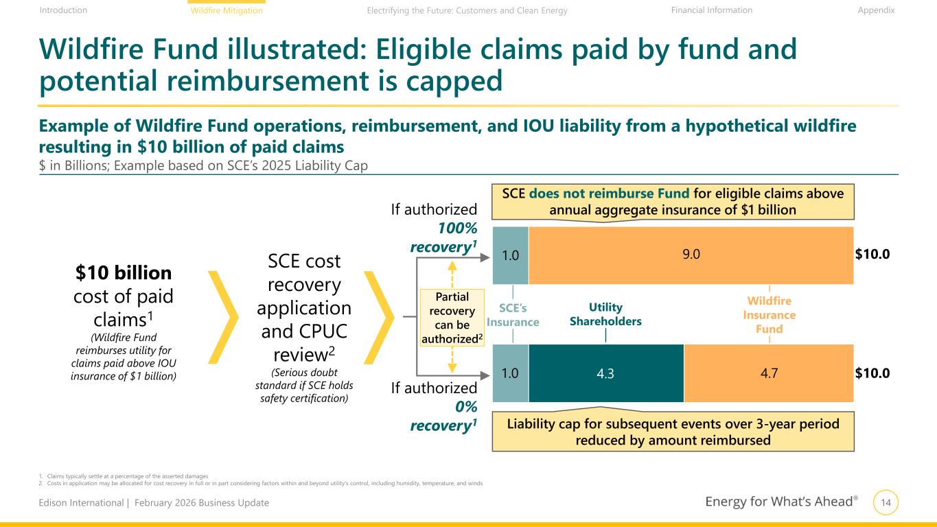 13Edison International | February 2026 Business Update Financial Information AppendixIntroduction Wildfire Mitigation Electrifying the Future: Customers and Clean Energy Wildfire Fund provides liquidity for claims payments and ceiling on liability to reimburse fund AB 1054 Wildfire Fund (Initial Account) Mechanics1 1. This summary is based on Edison International’s interpretation of Assembly Bill 1054 (2019) and clarifications made in Senate Bill 599 (2022) and Senate Bill 254 (2025) 2. “Eligible claims”: claims for third-party damages from covered wildfires less annual utility retention (larger of $1.0 billion or required insurance layer per fund administrator) 3. Excluding general plant and intangibles • Pay out claims to claimants subject to fund administrator approval • Subrogation claims settled at ≤40% approved unless exceptional facts and circumstances; higher amounts may be approved by fund administrator Fund payment of “eligible claims”2 CPUC prudency determination (serious doubt standard if utility holds safety cert.) • Covers claims payments resulting from wildfires ignited on or after July 12, 2019, either (a) caused by PG&E, SCE, or SDG&E, as determined by the governmental agency responsible for determining causation, or (b) asserted to have been caused by PG&E, SCE, or SDG&E, and results in a court-approved dismissal resulting from settlement of third-party damage claims, in excess of annual utility insurance ($1 billion)2 • Claim-paying capacity of $21+ billion. Fund can securitize future contributions if necessary to capitalize the fund • Fund reimbursed if imprudent (see below right), but does not have a separate replenishment mechanism Wildfire Insurance Fund • Liability cap of 20% of T&D Equity Rate Base (~$4.3Bn for SCE for 2025)3 unless found to have acted with conscious or willful disregard of the rights and safety of others • Liability cap lapses when fund exhausted; prudency standard remains If found imprudent, IOU reimburses Wildfire Fund up to 3-year rolling cap If found prudent, IOU does not reimburse Wildfire Fund PG&E: $4.8Bn initial + $193MM annually through 2028 SCE: $2.4Bn initial + $95MM annually through 2028 SDG&E: $0.3Bn initial + $13MM annually through 2028 IOUs contribute $10.5 billion Customers contribute $0.9Bn annually through 2035. May be directly contributed to Fund or used to support issuance of bonds by California DWR Customers contribute non-bypassable charge