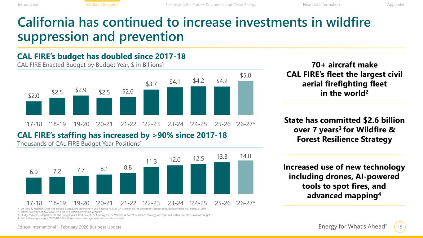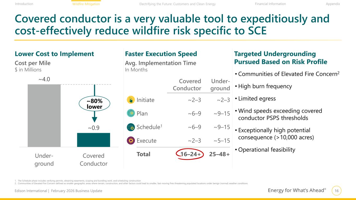 15Edison International | February 2026 Business Update Financial Information AppendixIntroduction Wildfire Mitigation Electrifying the Future: Customers and Clean Energy $2.0 $2.5 $2.9 $2.5 $2.6 $3.7 $4.1 $4.2 $4.2 $5.0 '17-18 '18-19 '19-20 '20-21 '21-22 '22-23 '23-24 '24-25 '25-26 '26-27* California has continued to increase investments in wildfire suppression and prevention 70+ aircraft make CAL FIRE’s fleet the largest civil aerial firefighting fleet in the world2 1. As initially enacted. Does not include subsequent Emergency Fund funding. *: 2026-27 is based on the Governor’s proposed budget released on January 9, 2026 2. https://www.fire.ca.gov/what-we-do/fire-protection/aviation-program 3. Budgeted across departments and budget years. Portions of the funding for the Wildfire & Forest Resilience Strategy are captured within CAL FIRE’s overall budget 4. https://www.gov.ca.gov/2025/01/13/california-forest-management-hotter-drier-climate/ CAL FIRE’s budget has doubled since 2017-18 CAL FIRE Enacted Budget by Budget Year, $ in Billions1 CAL FIRE’s staffing has increased by >90% since 2017-18 Thousands of CAL FIRE Budget Year Positions1 6.9 7.2 7.7 8.1 8.8 11.3 12.0 12.5 13.3 14.0 '17-18 '18-19 '19-20 '20-21 '21-22 '22-23 '23-24 '24-25 '25-26 '26-27* State has committed $2.6 billion over 7 years3 for Wildfire & Forest Resilience Strategy Increased use of new technology including drones, AI-powered tools to spot fires, and advanced mapping4