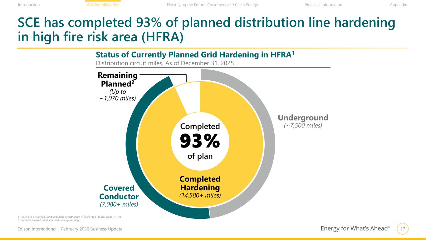 16Edison International | February 2026 Business Update Financial Information AppendixIntroduction Wildfire Mitigation Electrifying the Future: Customers and Clean Energy ~4.0 ~0.9 Under- ground Covered Conductor Covered conductor is a very valuable tool to expeditiously and cost-effectively reduce wildfire risk specific to SCE • Communities of Elevated Fire Concern2 • High burn frequency • Limited egress • Wind speeds exceeding covered conductor PSPS thresholds • Exceptionally high potential consequence (>10,000 acres) • Operational feasibility Cost per Mile $ in Millions Avg. Implementation Time In Months 1. The Schedule phase includes verifying permits, obtaining easements, scoping and bundling work, and scheduling construction 2. Communities of Elevated Fire Concern defined as smaller geographic areas where terrain, construction, and other factors could lead to smaller, fast-moving fires threatening populated locations under benign (normal) weather conditions Targeted Undergrounding Pursued Based on Risk Profile Lower Cost to Implement Faster Execution Speed Covered Conductor Under- ground Initiate ~2–3 ~2–3 Plan ~6–9 ~9–15 Schedule1 ~6–9 ~9–15 Execute ~2–3 ~5–15 Total 16–24+ 25–48+ ~80% lower