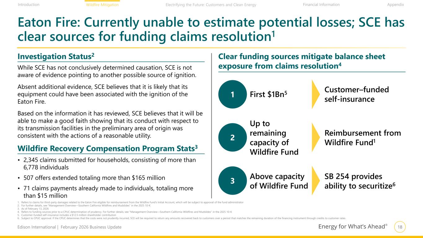 17Edison International | February 2026 Business Update Financial Information AppendixIntroduction Wildfire Mitigation Electrifying the Future: Customers and Clean Energy SCE has completed 93% of planned distribution line hardening in high fire risk area (HFRA) Completed Hardening (14,580+ miles) Underground (~7,500 miles) Covered Conductor (7,080+ miles) Status of Currently Planned Grid Hardening in HFRA1 Distribution circuit miles, As of December 31, 2025 Completed 93% of plan 1. Refers to circuit miles of distribution infrastructure in SCE’s high fire risk areas (HFRA) 2. Includes covered conductor and undergrounding Remaining Planned2 (Up to ~1,070 miles)