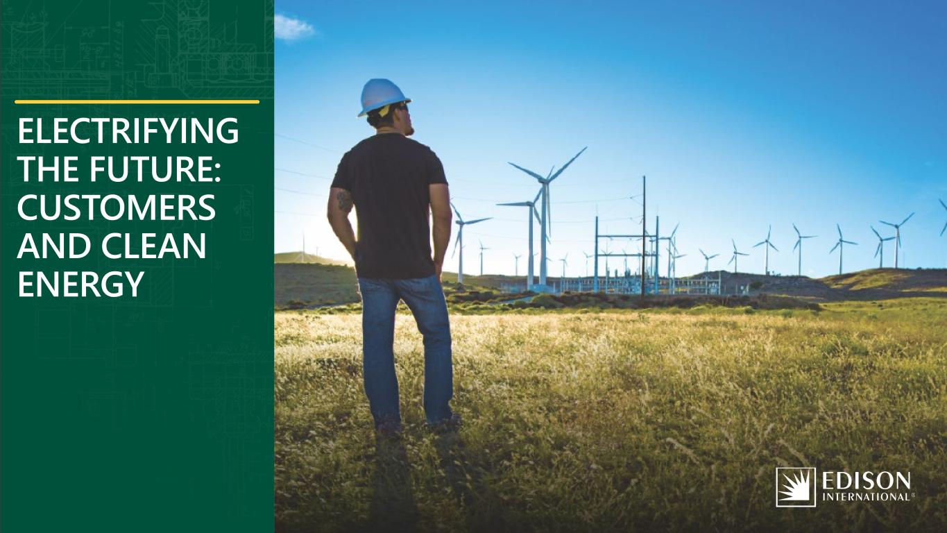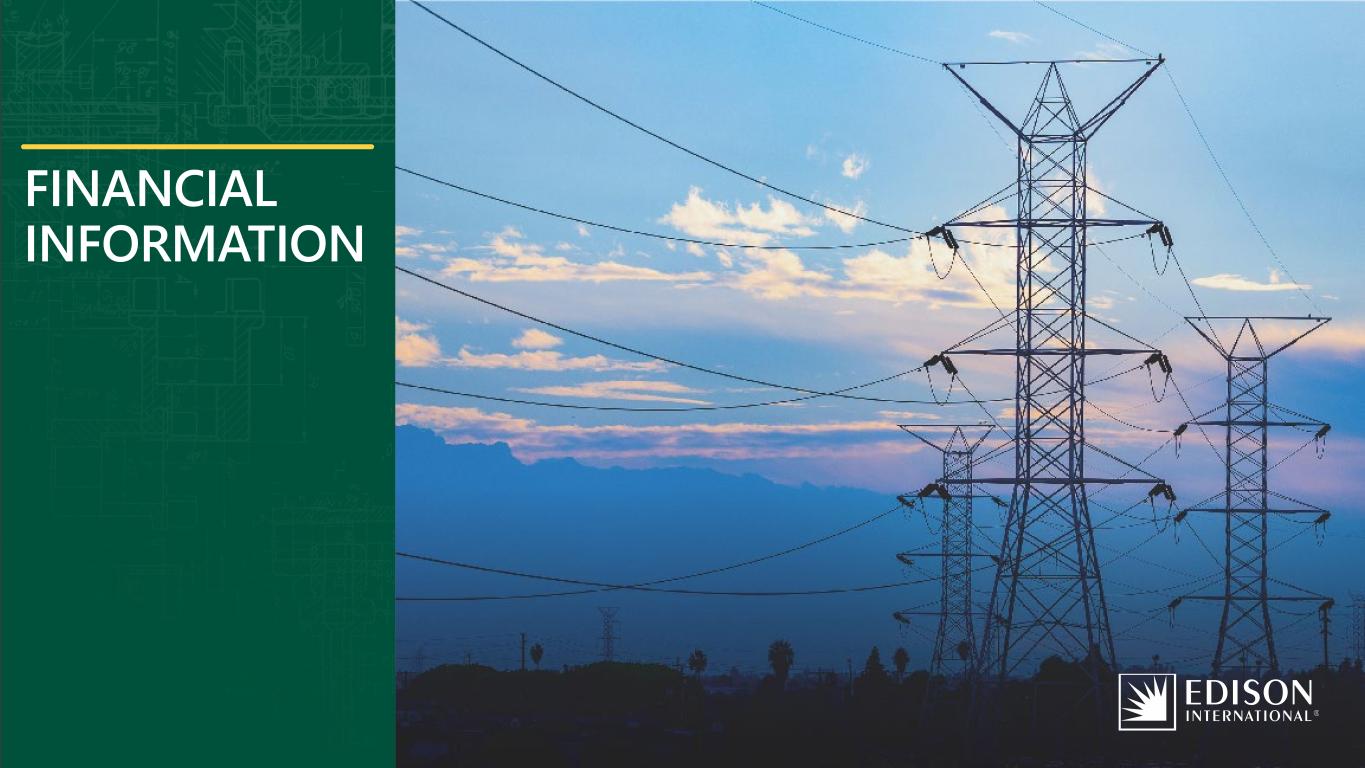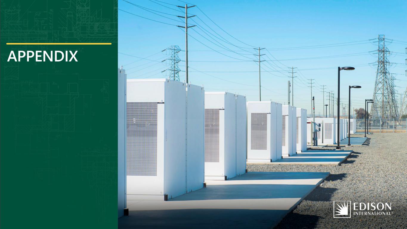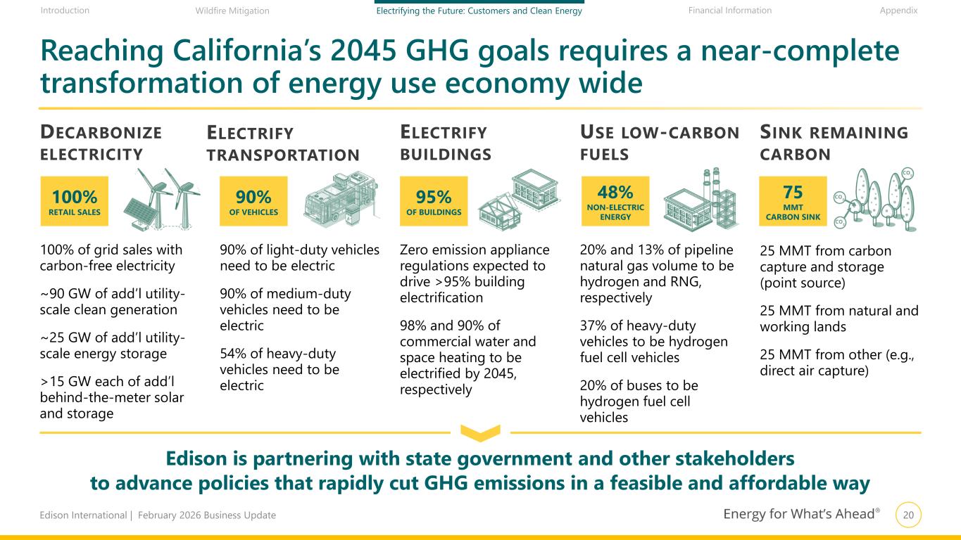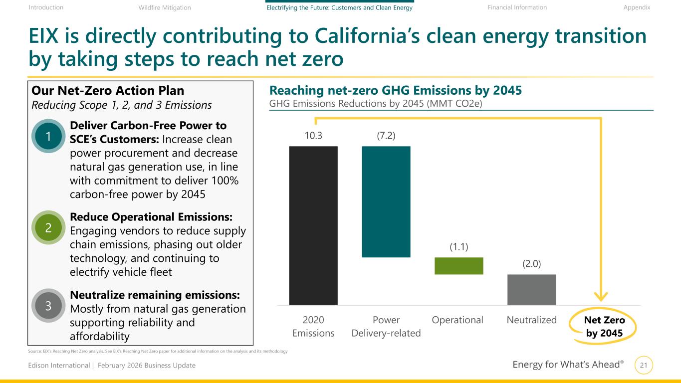 20Edison International | February 2026 Business Update Financial Information AppendixIntroduction Wildfire Mitigation Electrifying the Future: Customers and Clean Energy Reaching California’s 2045 GHG goals requires a near-complete transformation of energy use economy wide 100% of grid sales with carbon-free electricity ~90 GW of add’l utility- scale clean generation ~25 GW of add’l utility- scale energy storage >15 GW each of add’l behind-the-meter solar and storage Zero emission appliance regulations expected to drive >95% building electrification 98% and 90% of commercial water and space heating to be electrified by 2045, respectively 90% of light-duty vehicles need to be electric 90% of medium-duty vehicles need to be electric 54% of heavy-duty vehicles need to be electric 20% and 13% of pipeline natural gas volume to be hydrogen and RNG, respectively 37% of heavy-duty vehicles to be hydrogen fuel cell vehicles 20% of buses to be hydrogen fuel cell vehicles Edison is partnering with state government and other stakeholders to advance policies that rapidly cut GHG emissions in a feasible and affordable way 25 MMT from carbon capture and storage (point source) 25 MMT from natural and working lands 25 MMT from other (e.g., direct air capture) DECARBONIZE ELECTRICITY ELECTRIFY TRANSPORTATION ELECTRIFY BUILDINGS USE LOW-CARBON FUELS SINK REMAINING CARBON 100% RETAIL SALES 90% OF VEHICLES 95% OF BUILDINGS 48% NON-ELECTRIC ENERGY 75 MMT CARBON SINK