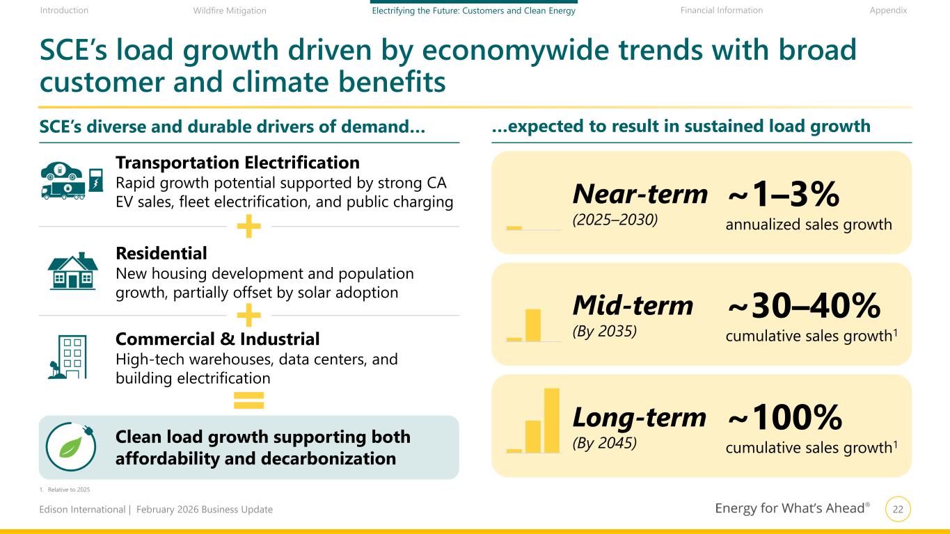 21Edison International | February 2026 Business Update Financial Information AppendixIntroduction Wildfire Mitigation Electrifying the Future: Customers and Clean Energy Neutralize remaining emissions: Mostly from natural gas generation supporting reliability and affordability EIX is directly contributing to California’s clean energy transition by taking steps to reach net zero Deliver Carbon-Free Power to SCE’s Customers: Increase clean power procurement and decrease natural gas generation use, in line with commitment to deliver 100% carbon-free power by 2045 1 2 3 Reduce Operational Emissions: Engaging vendors to reduce supply chain emissions, phasing out older technology, and continuing to electrify vehicle fleet Source: EIX’s Reaching Net Zero analysis. See EIX’s Reaching Net Zero paper for additional information on the analysis and its methodology 10.3 (7.2) (1.1) (2.0) 2020 Emissions Power Delivery-related Operational Neutralized Our Net-Zero Action Plan Reducing Scope 1, 2, and 3 Emissions Reaching net-zero GHG Emissions by 2045 GHG Emissions Reductions by 2045 (MMT CO2e) Net Zero by 2045