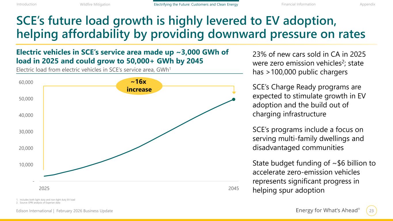 22Edison International | February 2026 Business Update Financial Information AppendixIntroduction Wildfire Mitigation Electrifying the Future: Customers and Clean Energy SCE’s load growth driven by economywide trends with broad customer and climate benefits SCE’s diverse and durable drivers of demand… …expected to result in sustained load growth Transportation Electrification Rapid growth potential supported by strong CA EV sales, fleet electrification, and public charging Residential New housing development and population growth, partially offset by solar adoption Commercial & Industrial High-tech warehouses, data centers, and building electrification Near-term (2025–2030) Clean load growth supporting both affordability and decarbonization ~1–3% annualized sales growth ~30–40% cumulative sales growth1 ~100% cumulative sales growth1 Mid-term (By 2035) Long-term (By 2045) 1. Relative to 2025