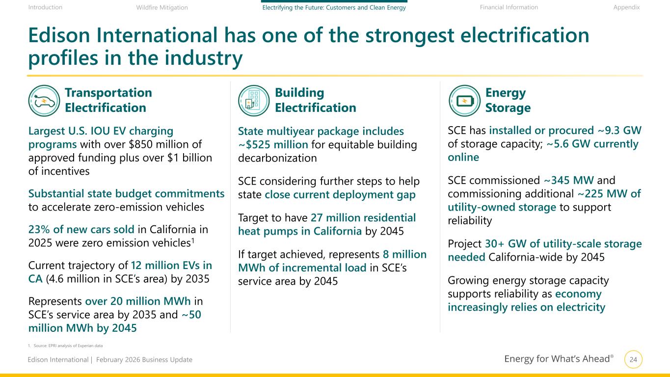 23Edison International | February 2026 Business Update Financial Information AppendixIntroduction Wildfire Mitigation Electrifying the Future: Customers and Clean Energy SCE’s future load growth is highly levered to EV adoption, helping affordability by providing downward pressure on rates 1. Includes both light duty and non-light duty EV load 2. Source: EPRI analysis of Experian data 23% of new cars sold in CA in 2025 were zero emission vehicles2; state has >100,000 public chargers SCE’s Charge Ready programs are expected to stimulate growth in EV adoption and the build out of charging infrastructure SCE’s programs include a focus on serving multi-family dwellings and disadvantaged communities State budget funding of ~$6 billion to accelerate zero-emission vehicles represents significant progress in helping spur adoption Electric vehicles in SCE’s service area made up ~3,000 GWh of load in 2025 and could grow to 50,000+ GWh by 2045 Electric load from electric vehicles in SCE’s service area, GWh1 - 10,000 20,000 30,000 40,000 50,000 60,000 2025 2045 ~16x increase