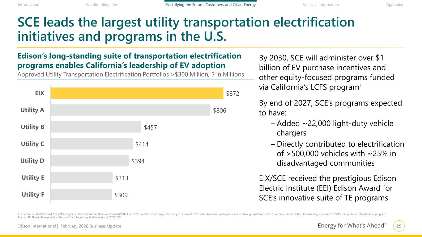 24Edison International | February 2026 Business Update Financial Information AppendixIntroduction Wildfire Mitigation Electrifying the Future: Customers and Clean Energy Edison International has one of the strongest electrification profiles in the industry 1. Source: EPRI analysis of Experian data State multiyear package includes ~$525 million for equitable building decarbonization SCE considering further steps to help state close current deployment gap Target to have 27 million residential heat pumps in California by 2045 If target achieved, represents 8 million MWh of incremental load in SCE’s service area by 2045 SCE has installed or procured ~9.3 GW of storage capacity; ~5.6 GW currently online SCE commissioned ~345 MW and commissioning additional ~225 MW of utility-owned storage to support reliability Project 30+ GW of utility-scale storage needed California-wide by 2045 Growing energy storage capacity supports reliability as economy increasingly relies on electricity Largest U.S. IOU EV charging programs with over $850 million of approved funding plus over $1 billion of incentives Substantial state budget commitments to accelerate zero-emission vehicles 23% of new cars sold in California in 2025 were zero emission vehicles1 Current trajectory of 12 million EVs in CA (4.6 million in SCE’s area) by 2035 Represents over 20 million MWh in SCE’s service area by 2035 and ~50 million MWh by 2045 Transportation Electrification Energy Storage Building Electrification