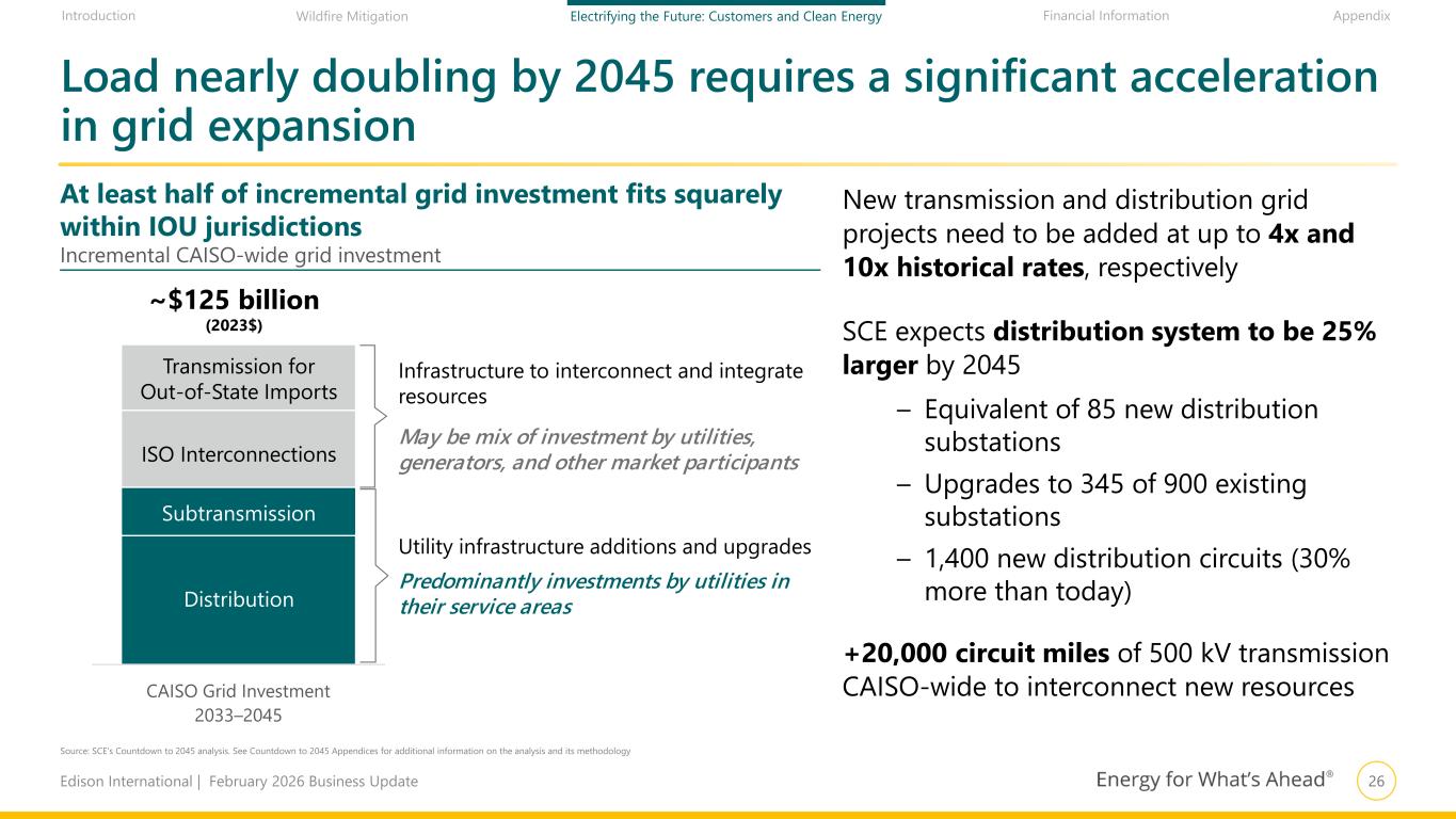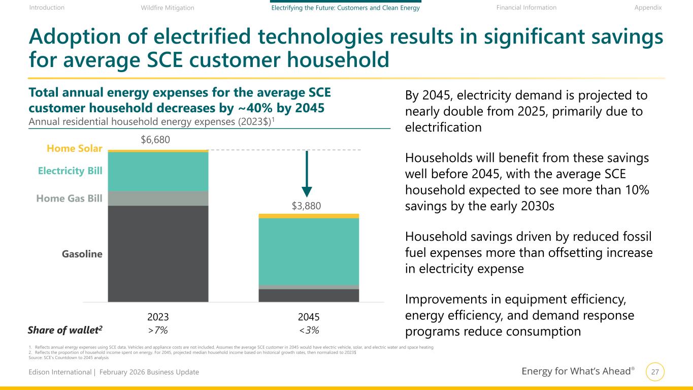 26Edison International | February 2026 Business Update Financial Information AppendixIntroduction Wildfire Mitigation Electrifying the Future: Customers and Clean Energy Load nearly doubling by 2045 requires a significant acceleration in grid expansion Source: SCE’s Countdown to 2045 analysis. See Countdown to 2045 Appendices for additional information on the analysis and its methodology CAISO Grid Investment 2033–2045 At least half of incremental grid investment fits squarely within IOU jurisdictions Incremental CAISO-wide grid investment ~$125 billion (2023$) Transmission for Out-of-State Imports ISO Interconnections Distribution Subtransmission Infrastructure to interconnect and integrate resources May be mix of investment by utilities, generators, and other market participants Utility infrastructure additions and upgrades Predominantly investments by utilities in their service areas New transmission and distribution grid projects need to be added at up to 4x and 10x historical rates, respectively SCE expects distribution system to be 25% larger by 2045 – Equivalent of 85 new distribution substations – Upgrades to 345 of 900 existing substations – 1,400 new distribution circuits (30% more than today) +20,000 circuit miles of 500 kV transmission CAISO-wide to interconnect new resources